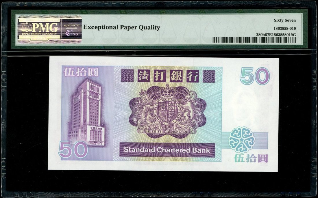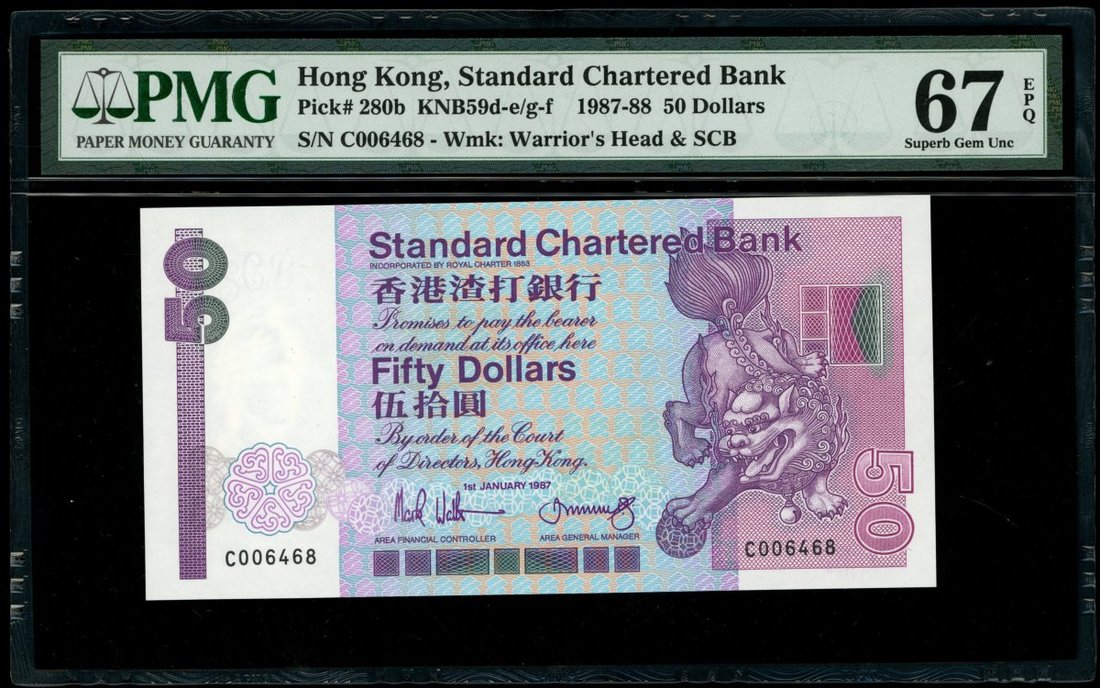 Standard Chartered Bank, $50, 1.1.1987, serial number C006468, (Pick 280b), PMG 67EPQ. Split prefix 1987 and 1988 with the 1987 date being much rarer