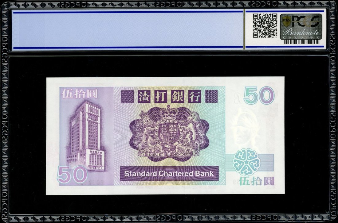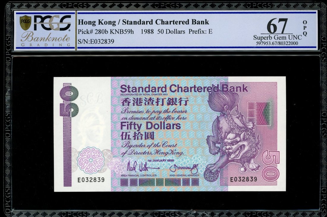 Standard Chartered Bank, $50, 1.1.1988, serial number E032839, (Pick 280b), PCGS Banknote Grading 67OPQ. Split prefix 1988 and 1990 with the 1988 date being much rarer