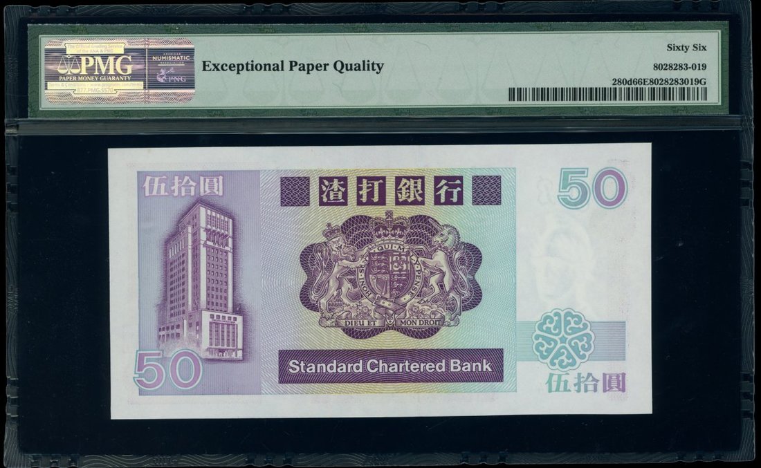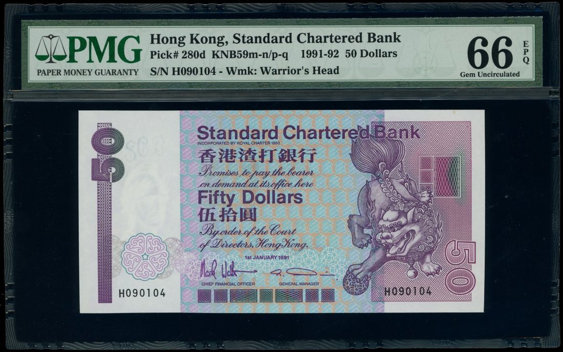 Standard Chartered Bank, $50, 1.1.1991, serial number H090104, (Pick 280d), PMG 66EPQ. Split prefix 1991 and 1992 with the 1991 date being much rarer