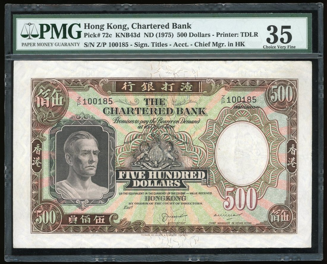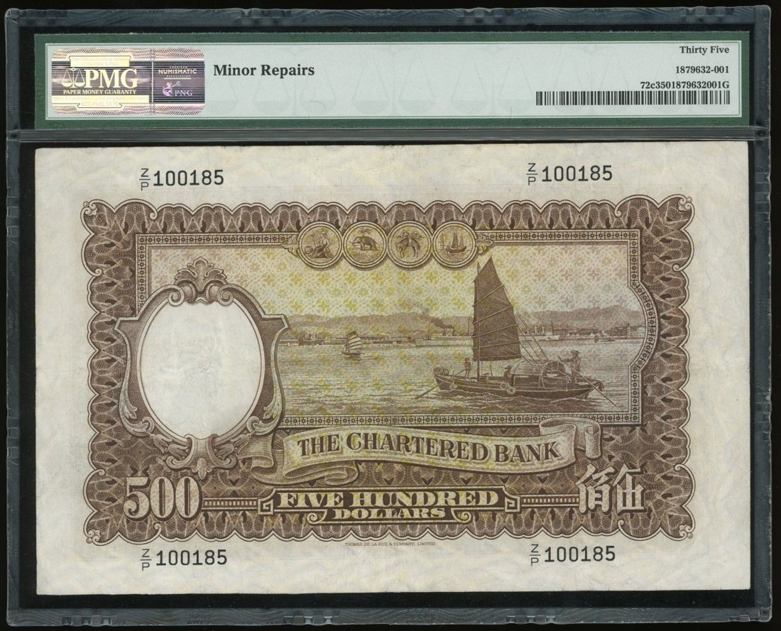 The Chartered Bank, $500, ND (1975), serial number Z/P 100185, (Pick 72c), PMG 35 Choice Very Fine (Minor Repairs)