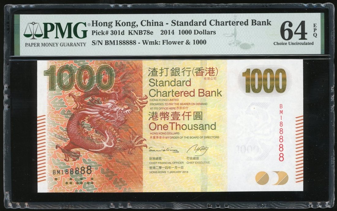 Standard Chartered Bank, $1000, 1.1.2014, near solid serial number BM188888, (Pick 301d), PMG 64EPQ Choice Uncirculated
