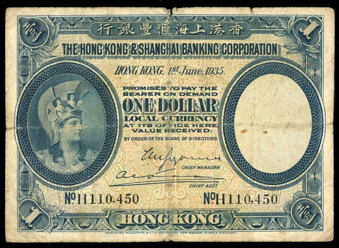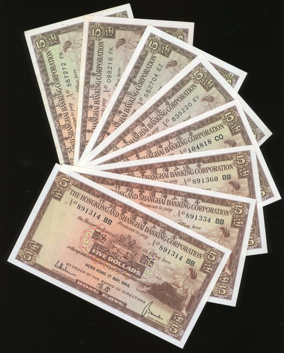 The Hongkong and Shanghai Banking Corporation, $1, 1.6.1935, serial number H110450, also 8x $5, 1.5.1964 (3), 27.3.1969 (1), 31.10.1973 (3) and 31.3.1975 (1), serial numbers 891314 BB, 334 BB, 360 BB, 104818 CQ, 835220 EY, 562704 EZ, 098216 FK and 587272 FK respectively,