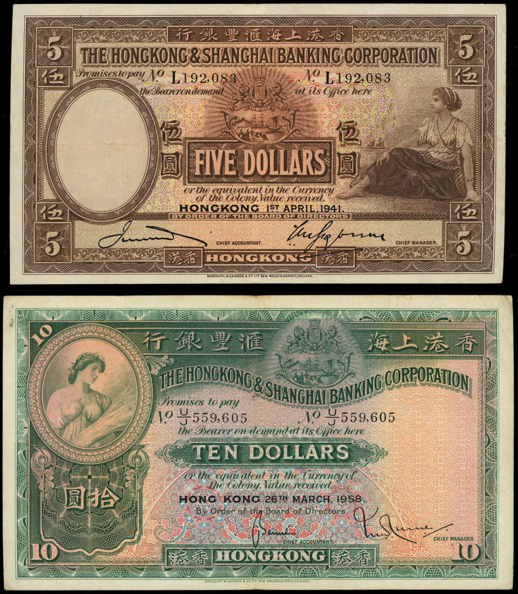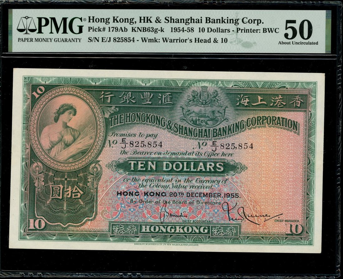 The Hongkong and Shanghai Banking Corporation, a group of 3 notes, $5, 1.4.1941 and a pair of $10, 1955 and 1958, serial numbers L192083, E/J 825854 and U/J 559605, (Pick 173d, 179Ab), 1955 $10 PMG 50 About Uncirculated, the rest very fine, 1958 $10 a scarcer date