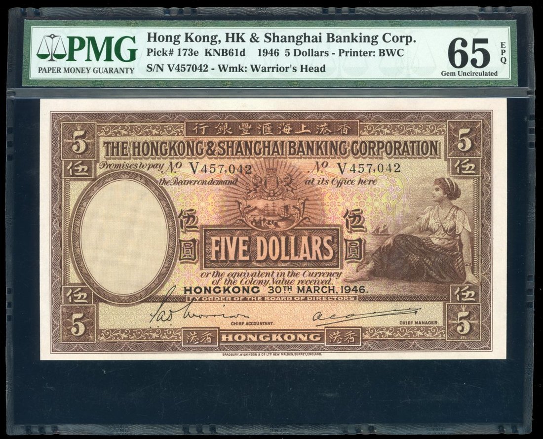 The Hongkong and Shanghai Banking Corporation, $5, 30.3.1946, serial number V457042, (Pick 173e), PMG 65EPQ Gem Uncirculated