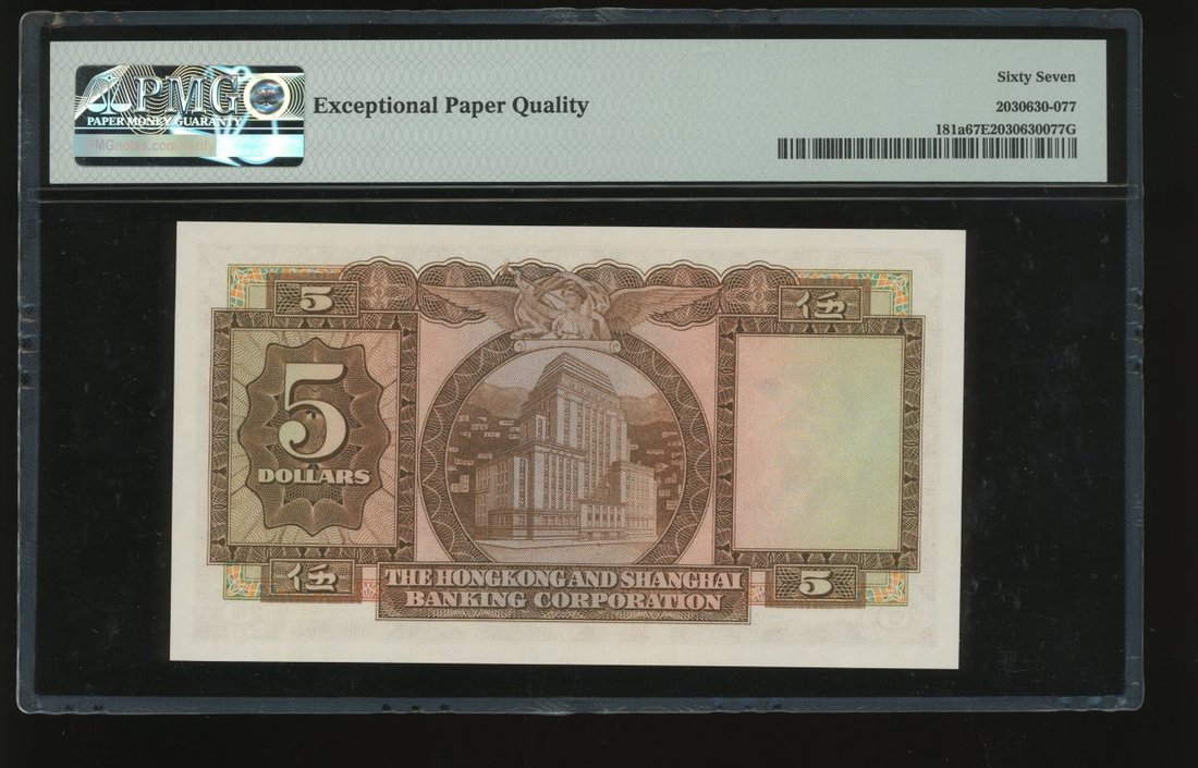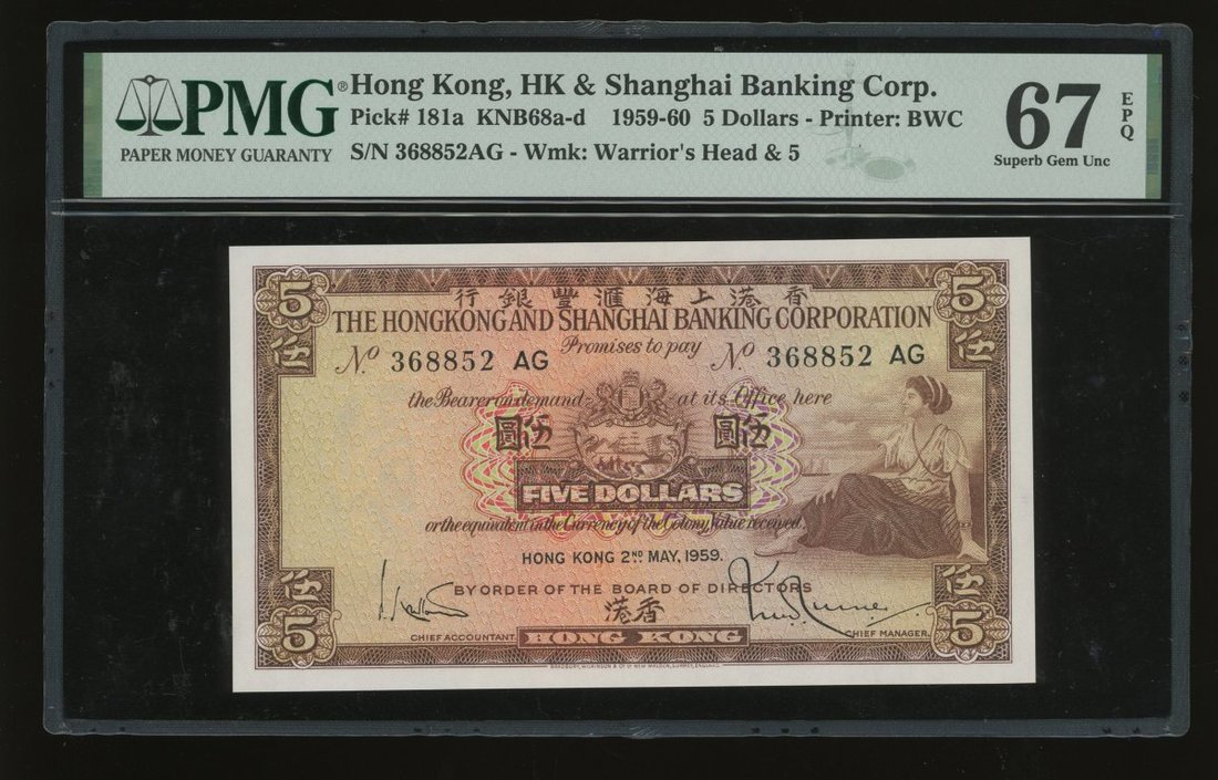 The Hongkong and Shanghai Banking Corporation, $5, 2.5.1959, serial number 368852 AG, (Pick 181a), PMG 67EPQ Superb Gem Uncirculated