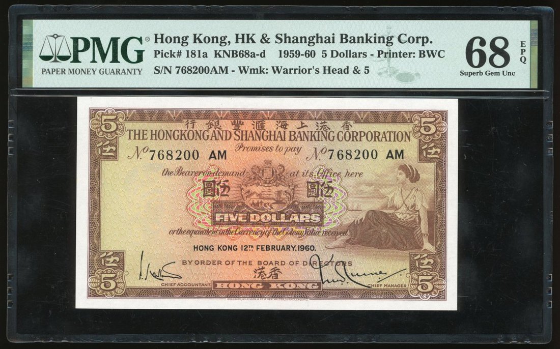 The Hongkong and Shanghai Banking Corporation, $5, 12.2.1960, serial number 768200 AM, (Pick 181a), PMG 68EPQ Superb Gem Uncirculated