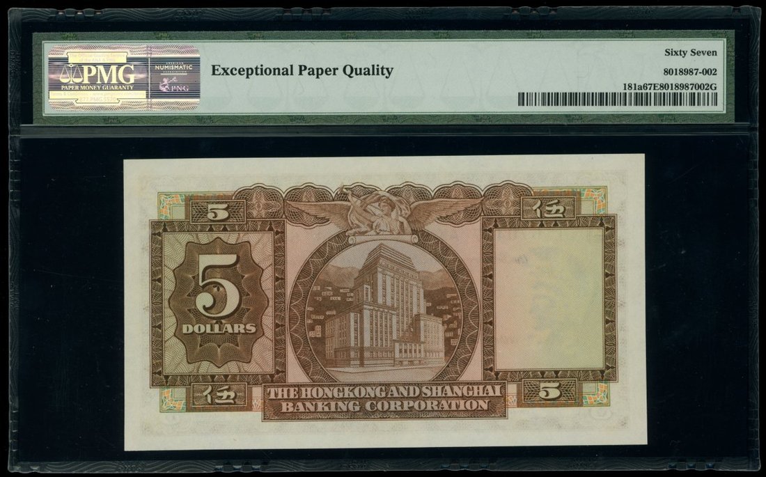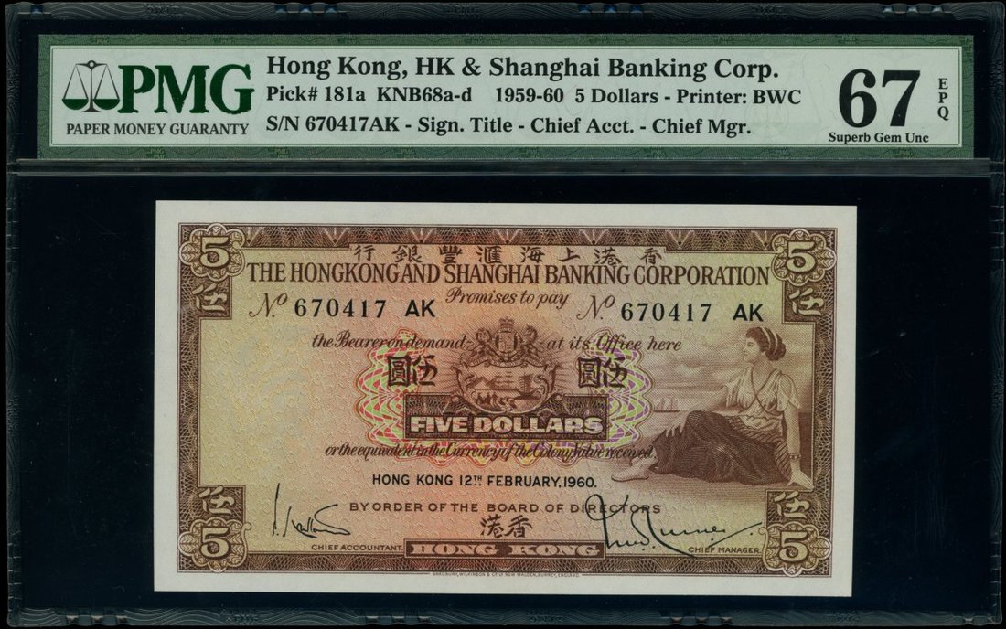 The Hongkong and Shanghai Banking Corporation, $5, 12.2.1960, serial number 670417 AK, (Pick 181a), PMG 67EPQ Superb Gem Uncirculated