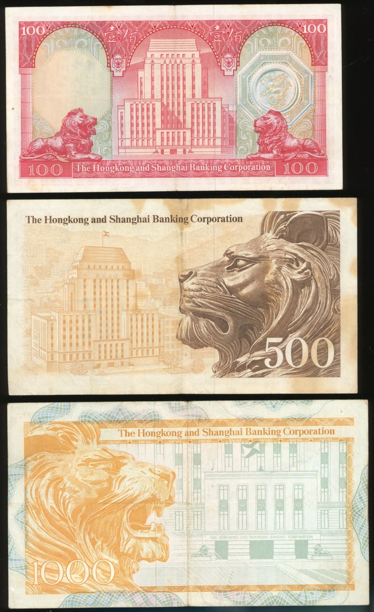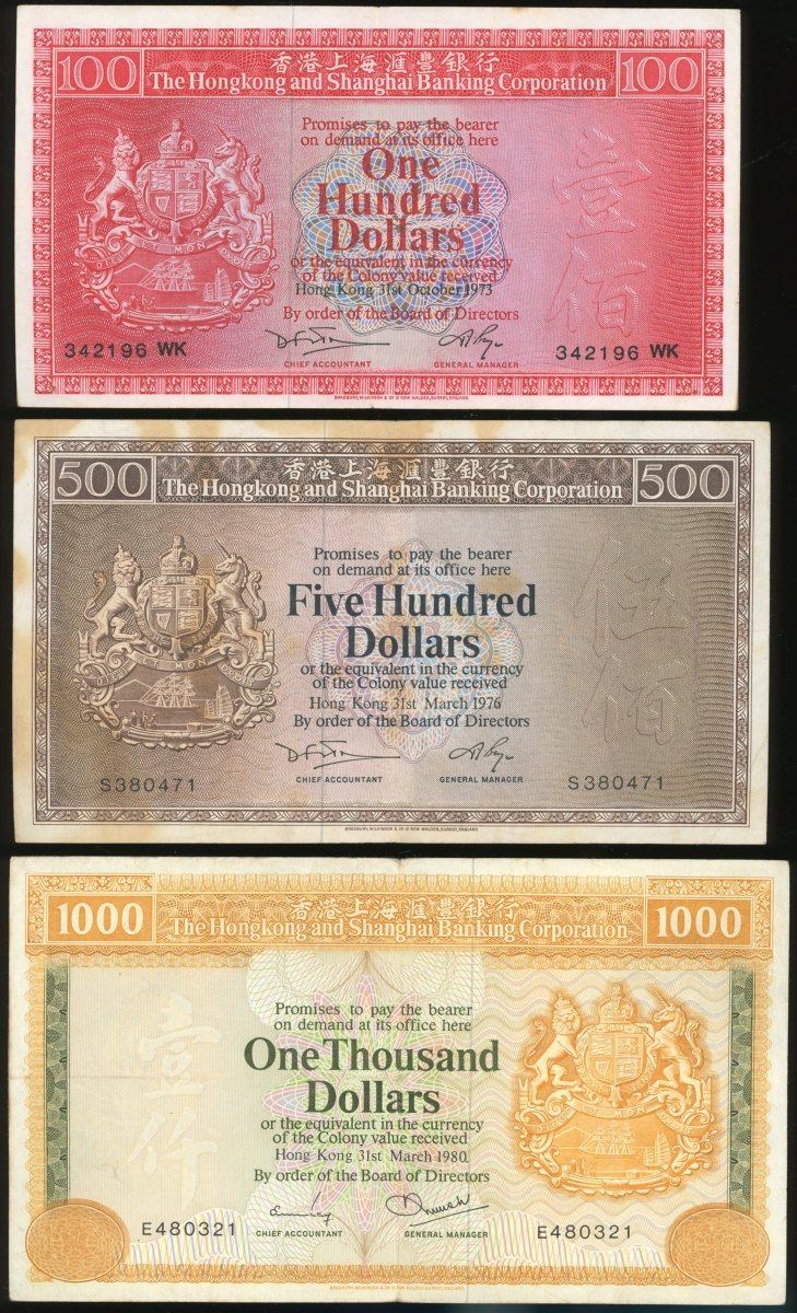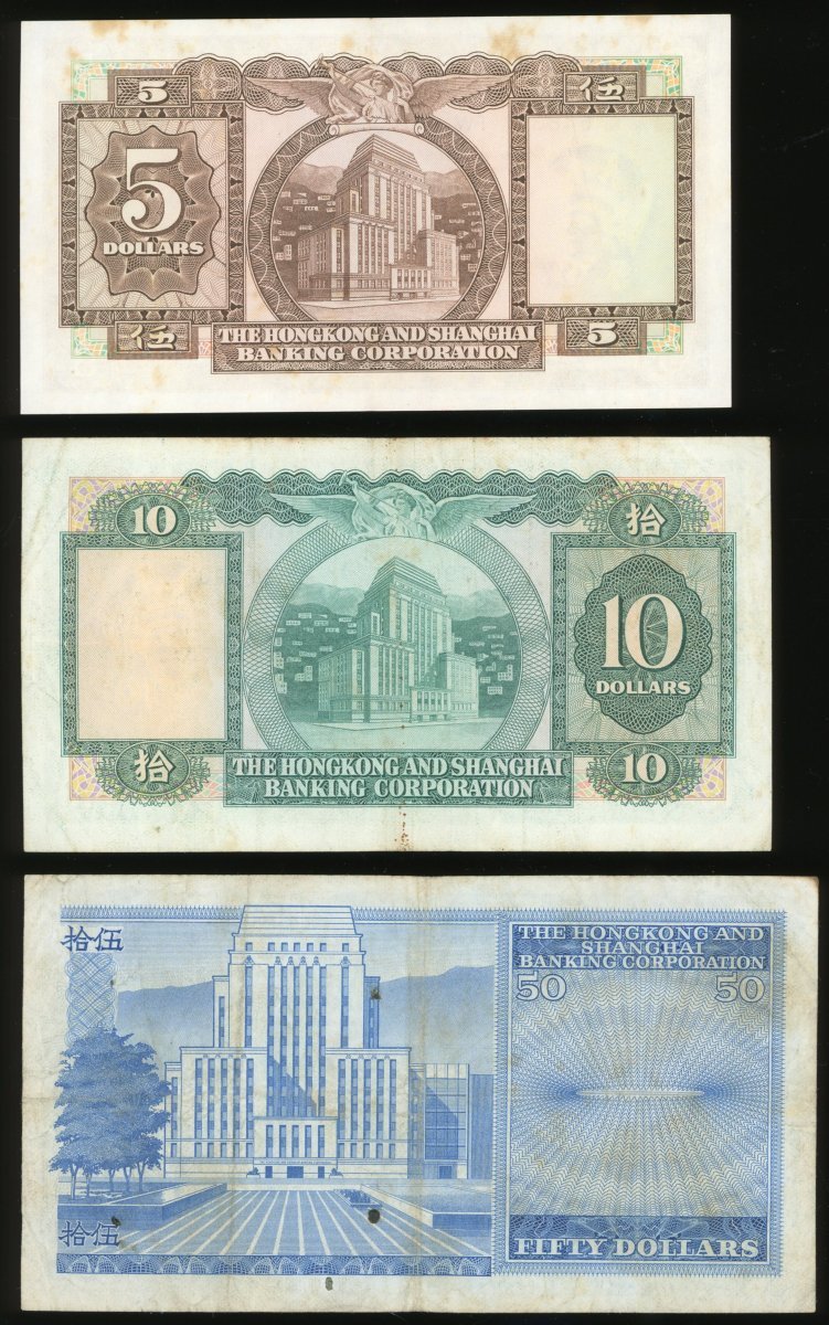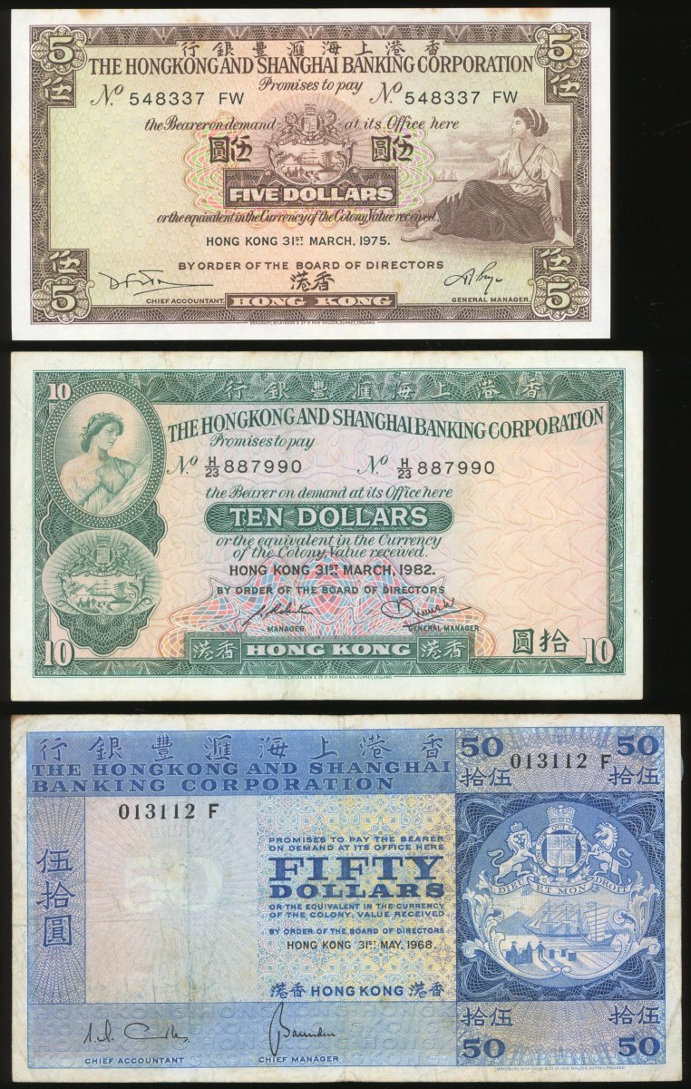 The Hongkong and Shanghai Banking Corporation, set of 6 notes from the late 1960's to early 1980's consisting of: $5, $10, $50, $100, $500 and $1000, serial numbers 548337 FW, H/23 887990, 013112 F, 342196 WK, S380471 and E480321 respectively,