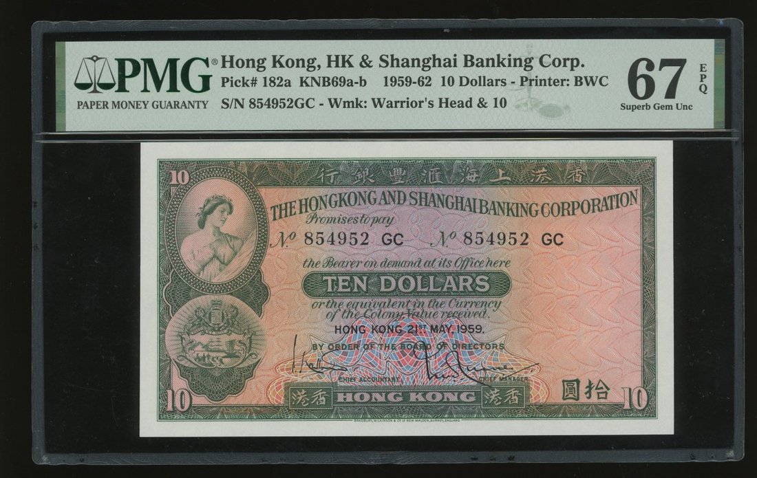 The Hongkong and Shanghai Banking Corporation, $10, 21.5.1959, serial number 854952 GC, (Pick 182a), PMG 67EPQ Superb Gem Uncirculated