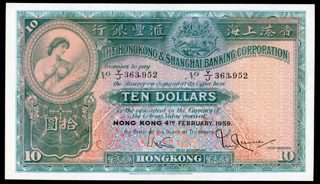 The Hongkong and Shanghai Banking Corporation, $10, 4.2.1959, serial number Y/J 363952, pressed good extremely fine