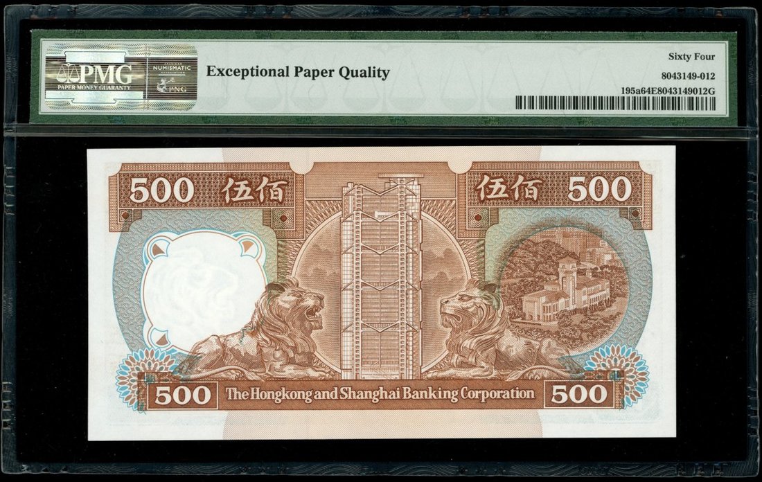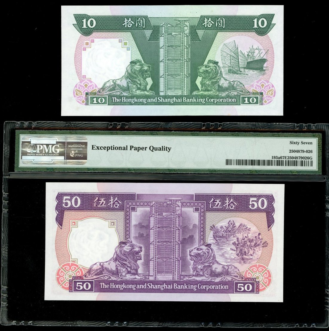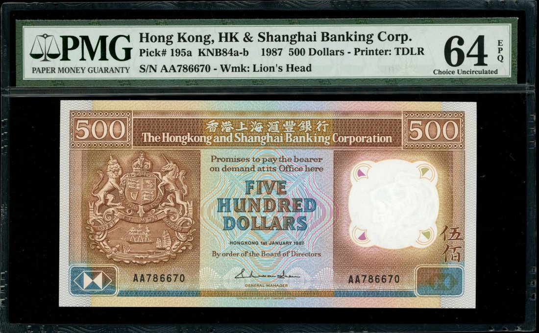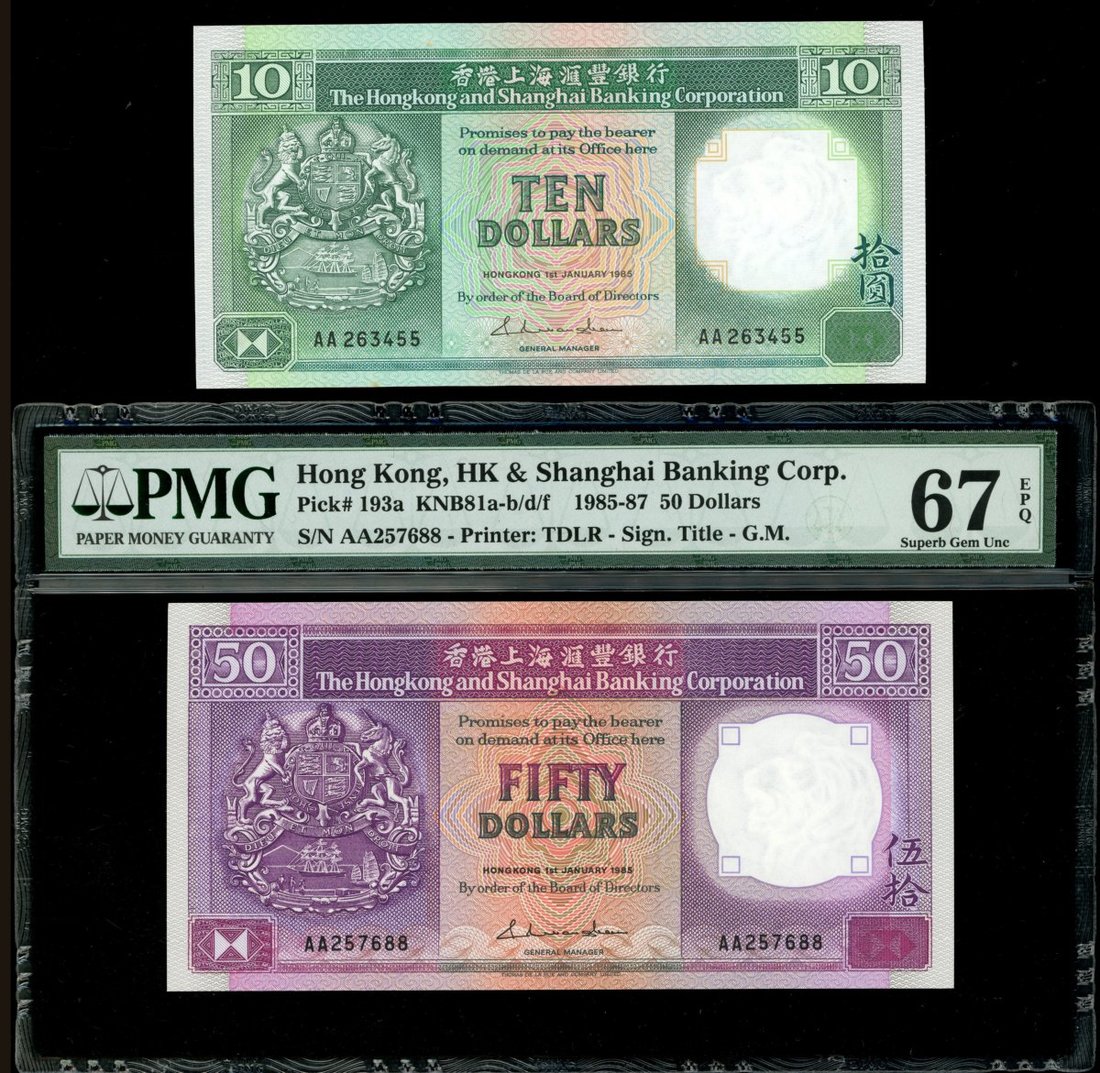 The Hongkong and Shanghai Banking Corporation, a group of 3 notes bearing the first 'AA" prefix, $10, 1.1.1985, AA263455, $50, 1.1.1985, AA 257688 and $500, 1.1.1987, AA786670,