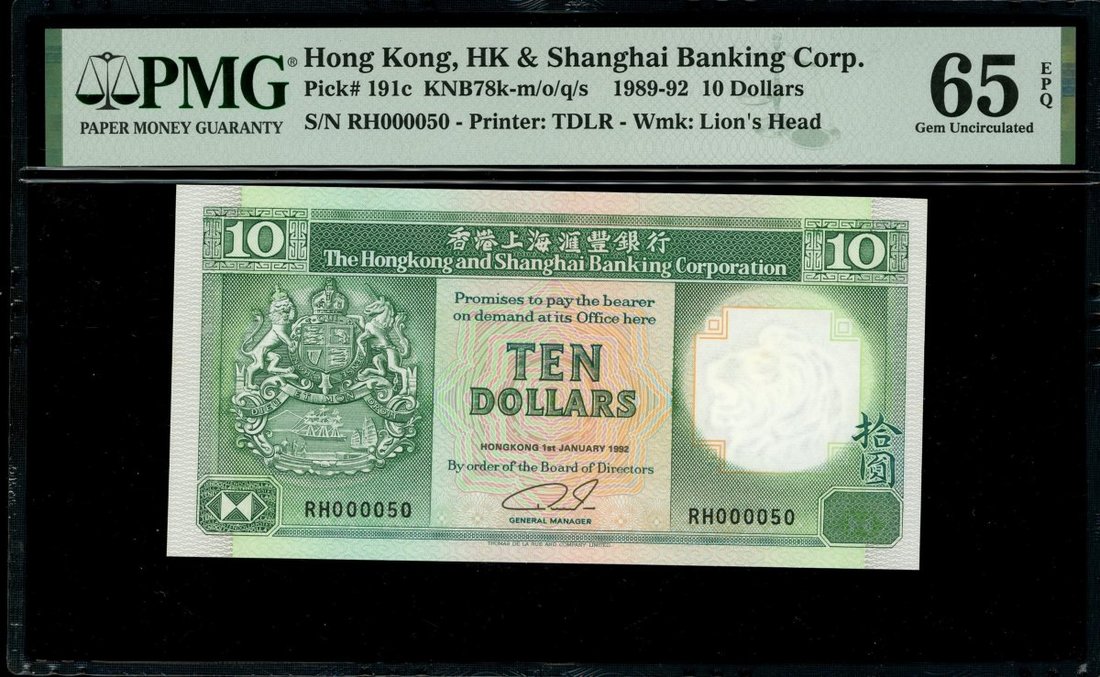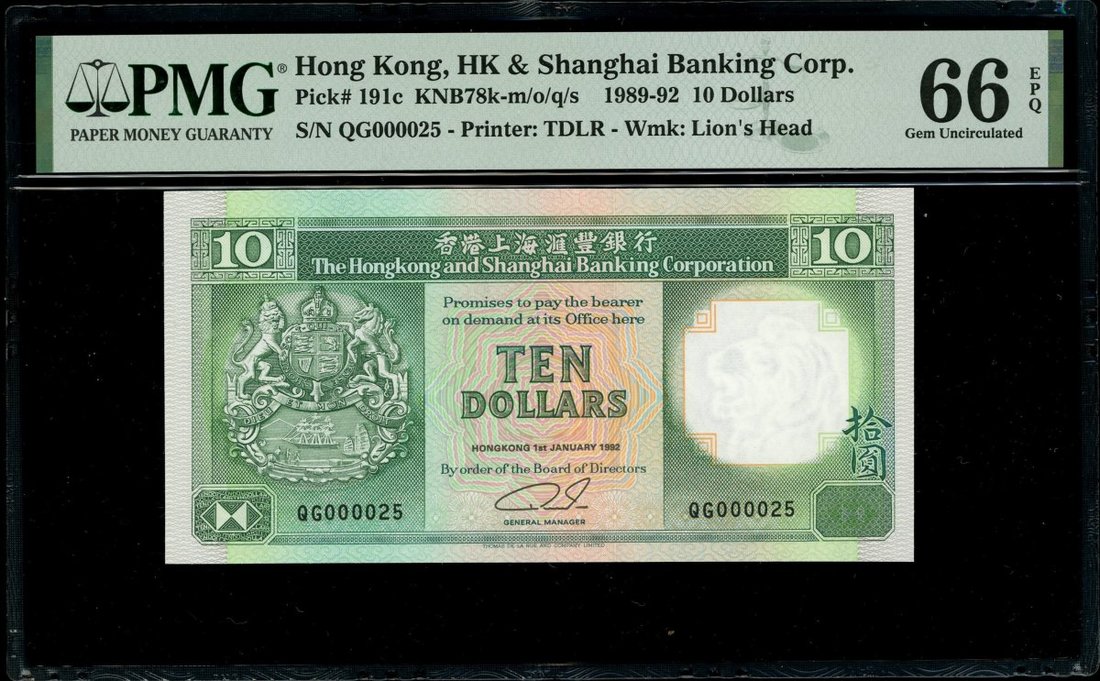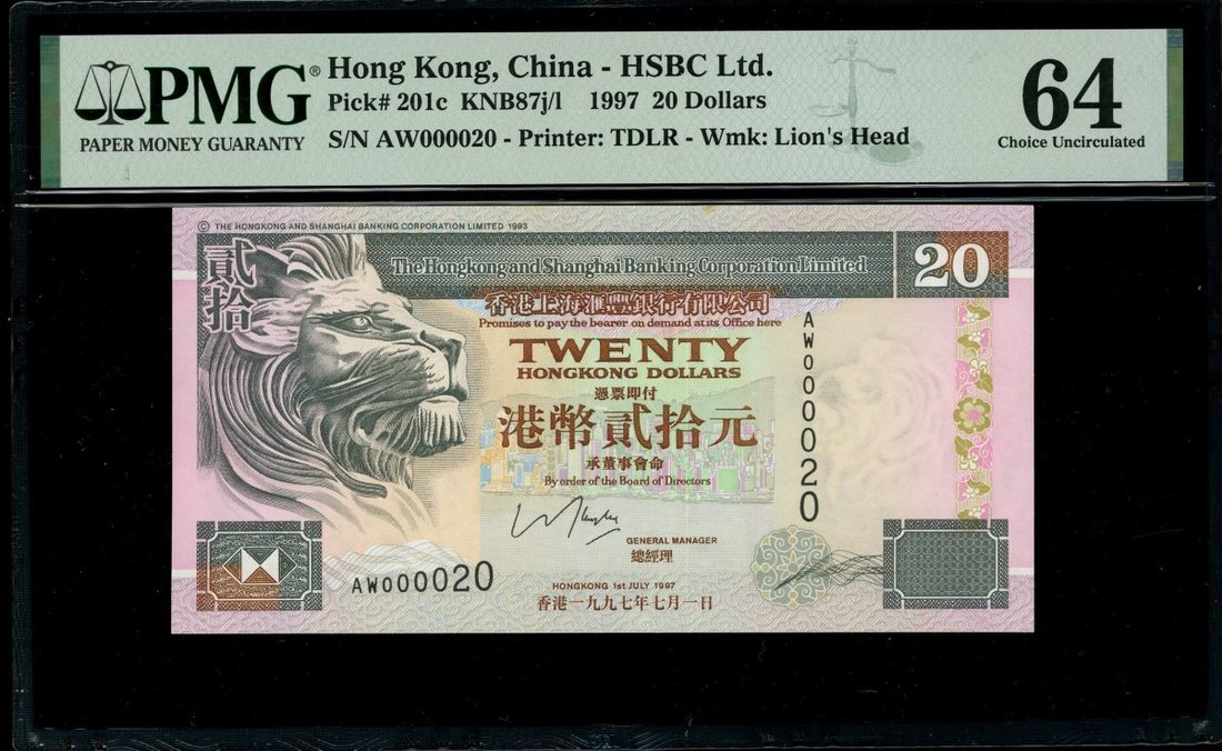 The Hongkong and Shanghai Banking Corporation, a group of 3 notes, a pair of $10, 1.1.1992, and $20, 1997, low serial numbers QG000025, RH000050 and AW000020 (Pick 191c and 201c), PMG 66EPQ, 65EPQ and PMG 64 respectively (3)