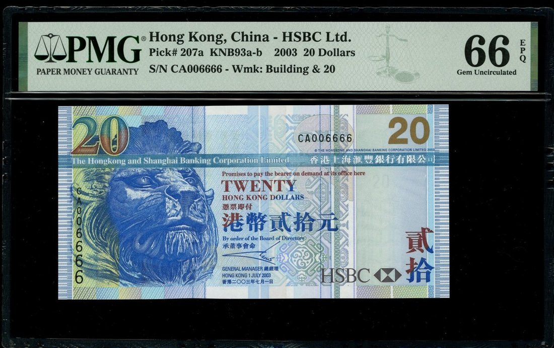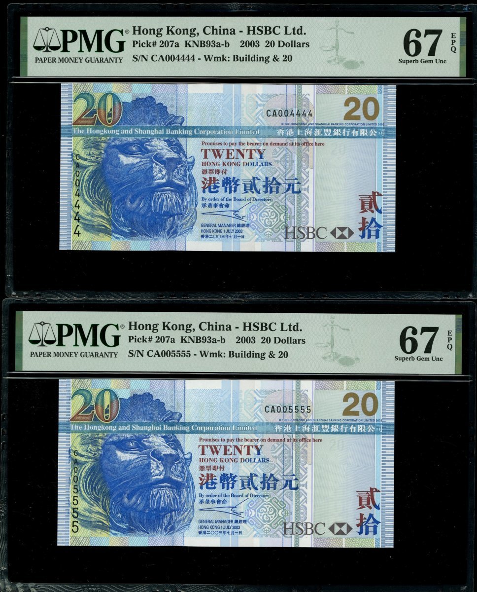 The Hongkong and Shanghai Banking Corporation, 3x $20, 1.7.2003, fancy serial numbers CA004444, 5555 and 6666, (Pick 207a), graded PMG 67EPQ, 67EPQ and 66EPQ (3).