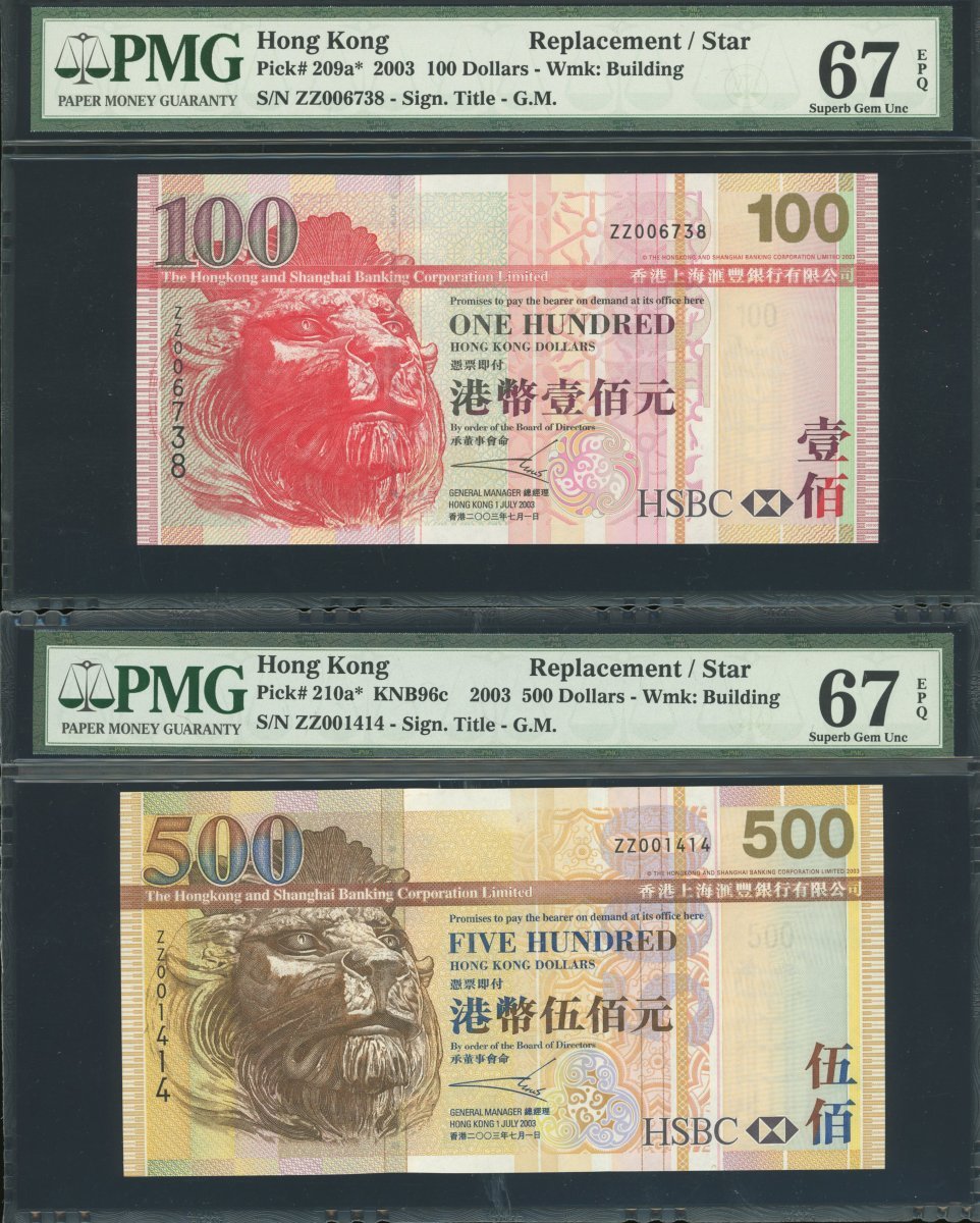The Hongkong and Shanghai Banking Corporation, lot of 4x replacement notes, $20, ZZ051701, $50, ZZ001414, $100, ZZ006738 and $500, ZZ001414, all dated 1.7.2003,
