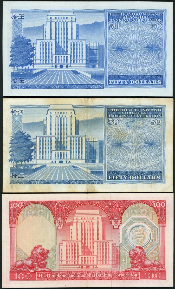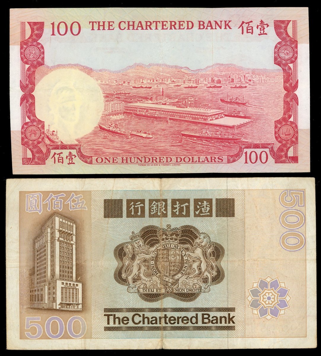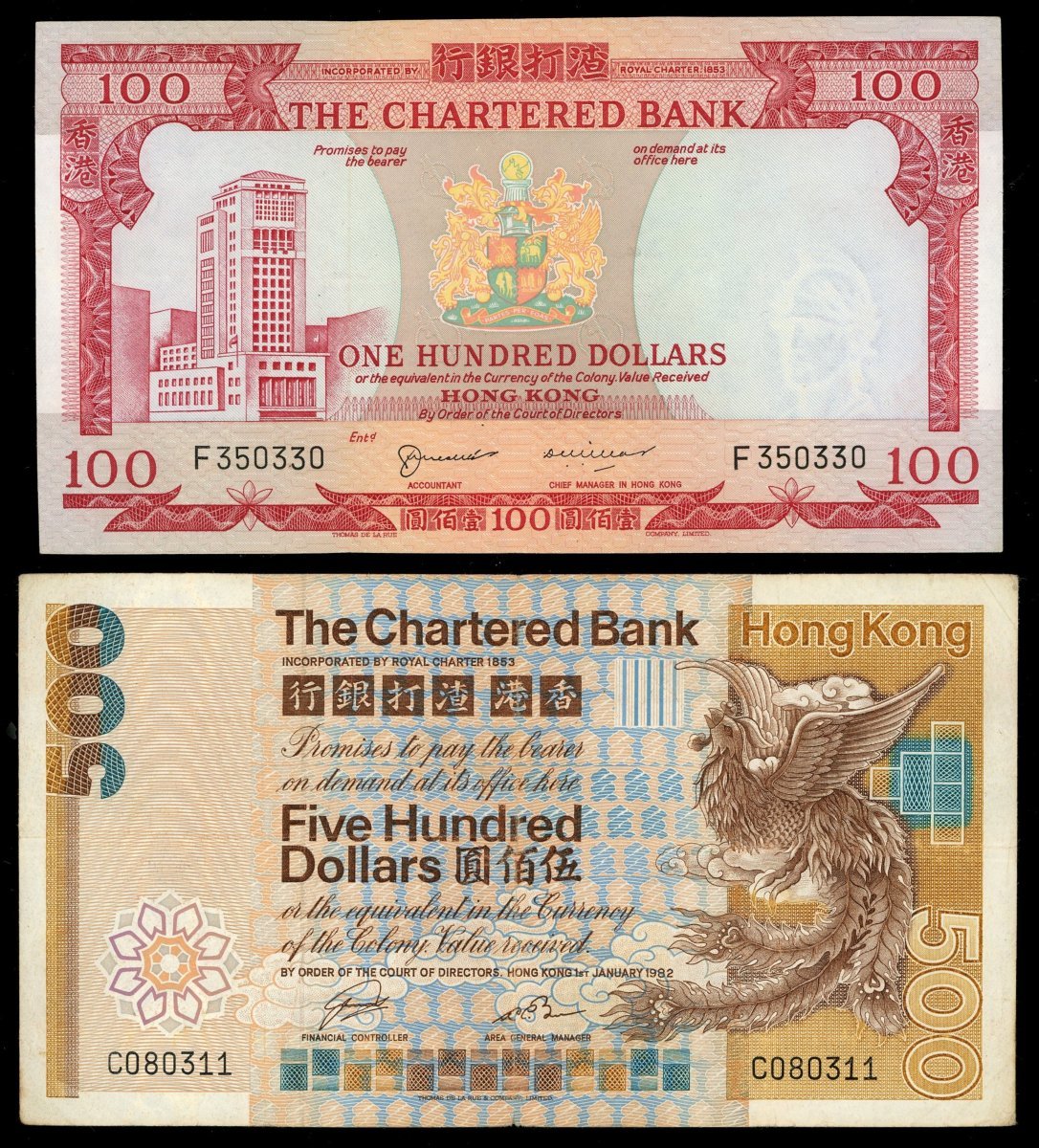 The Hongkong and Shanghai Banking Corporation, group of 3, consisting of 2x $50, 31.3.1975 and 31.3.1979, and $100, 31.10.1972, serial numbers 009353R, 677166V and 385039WF, and The Chartered Bank, $100, ND (1970-1975) and $500, 1.1.1982, serial numbers F350330 and C080311,