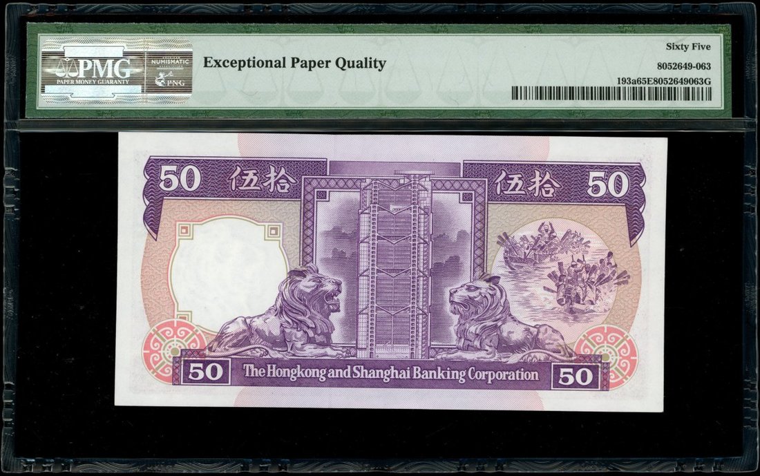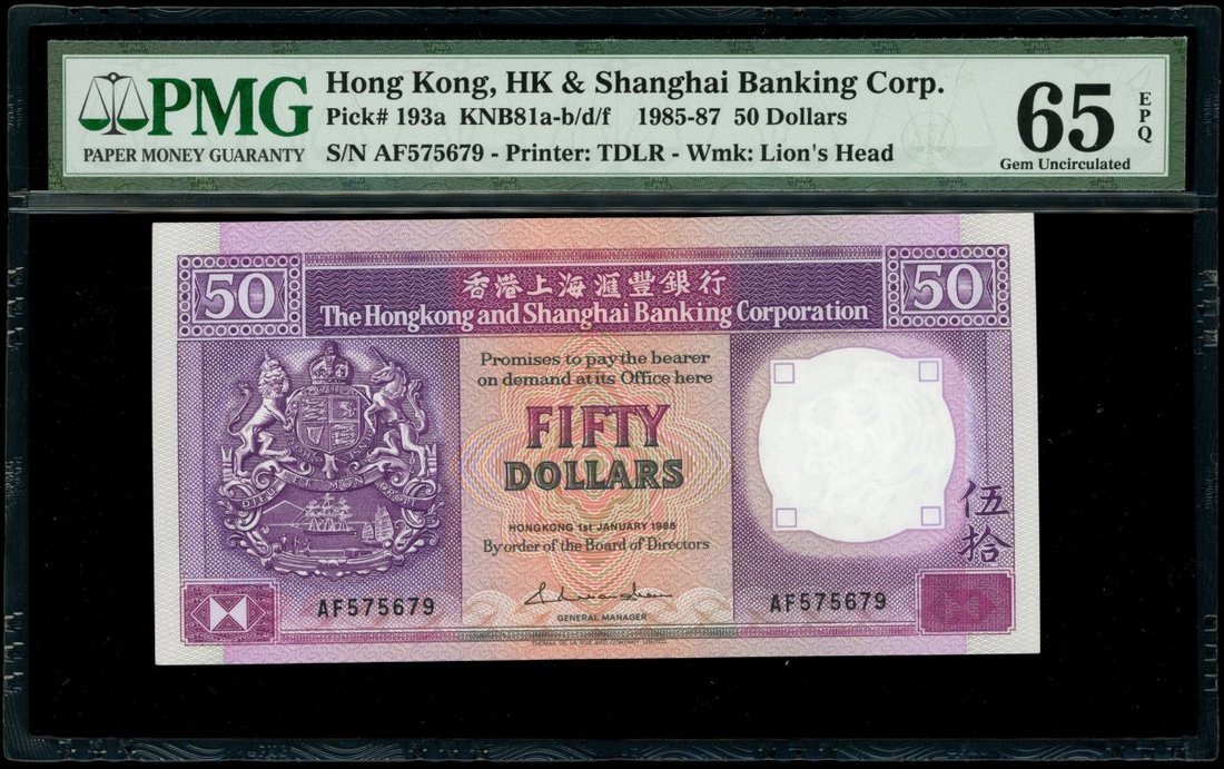 The Hongkong and Shanghai Banking Corporation, $50, 1.1.1986, serial number AF575679, (Pick 193a), PMG 65EPQ Gem Uncirculated, a rare and key date of issue