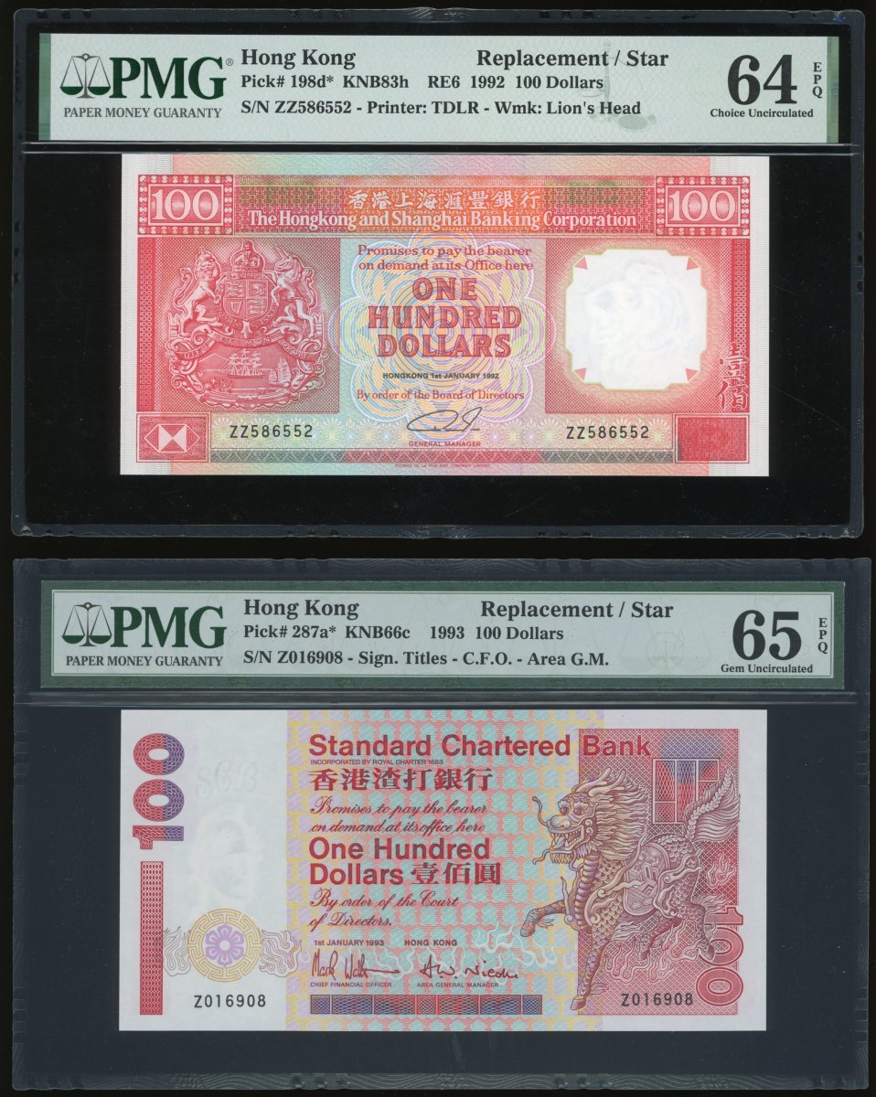 Hong Kong, a pair of HSBC and SCB $100, 1.1.1992 and 1.1.1993, replacement serial numbers ZZ586552 and Z016908, (Pick 198d*, 287a*), graded PMG 64EPQ and 65EPQ respectively (2)