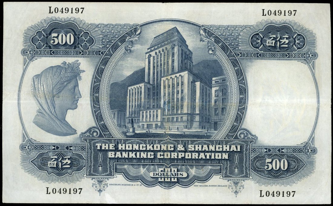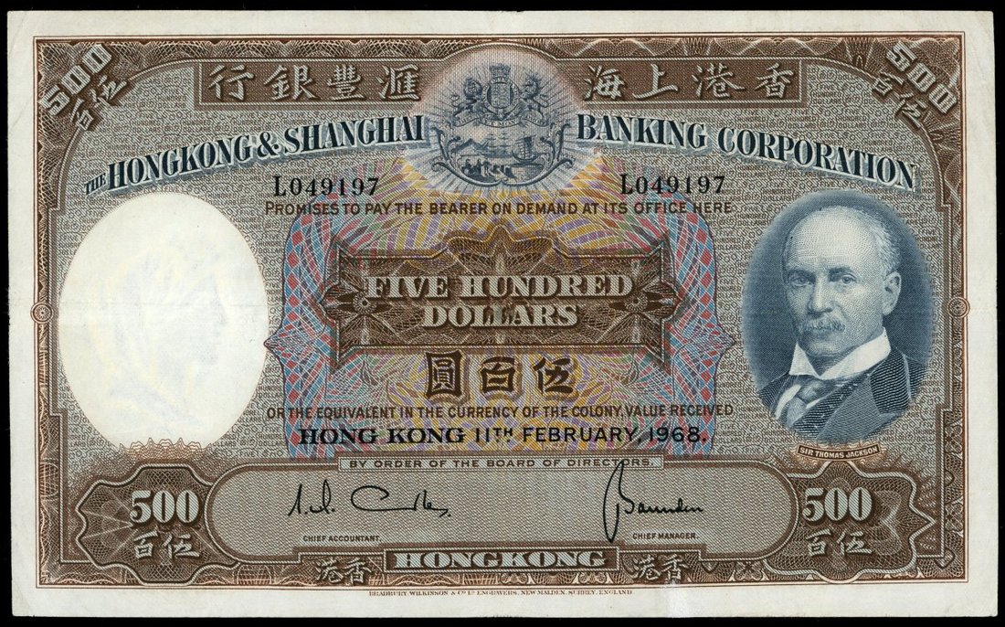 The Hongkong and Shanghai Banking Corporation, $500, 11.2.1968, serial number L049197, (Pick 179c), good extremely fine, minor repairs