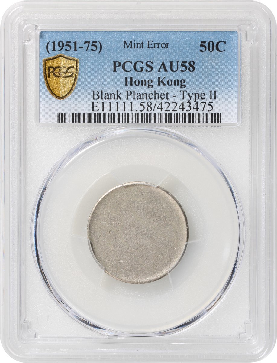 Hong Kong, 50 cents, ND (1951-1975), MINT ERROR, blank planchet - type II, PCGS AU58, #42243475.