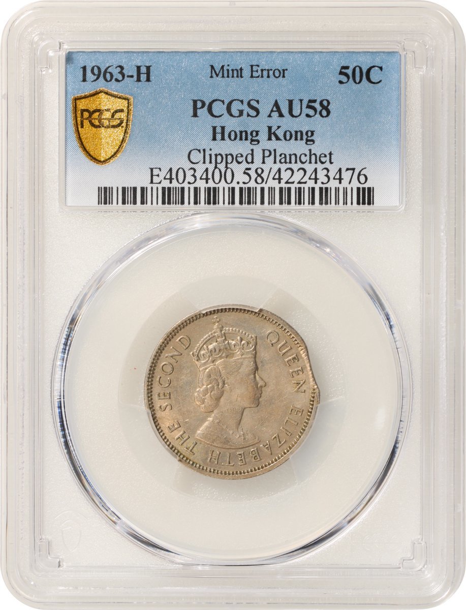 Hong Kong, copper nickel 50 cents, 1963-H, MINT ERROR, clipped planchet, PCGS AU58, #42243476.