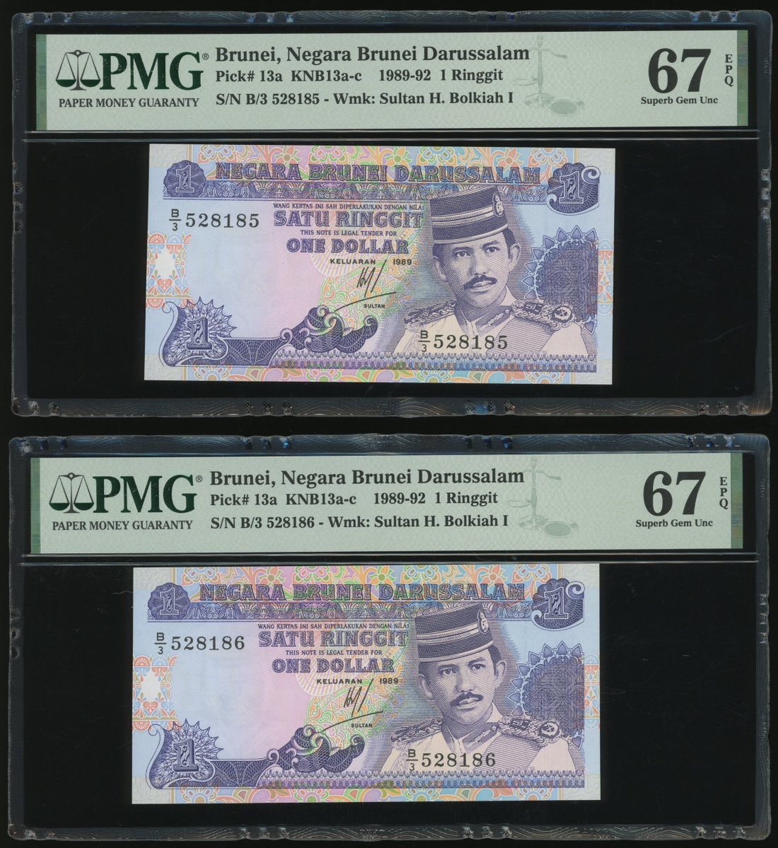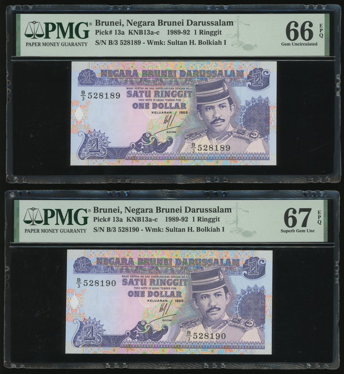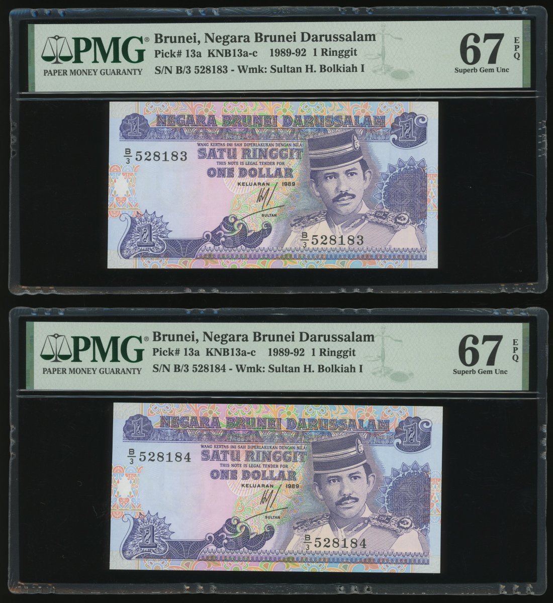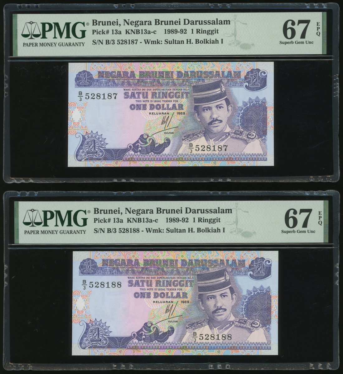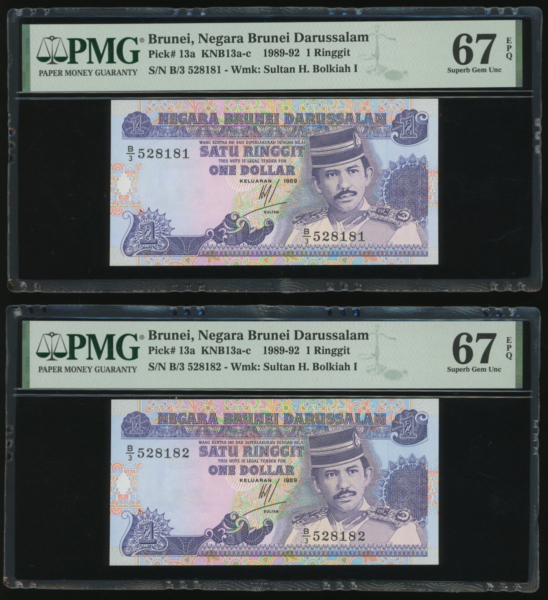Negara Brunei Darussalam, 10x 1 Ringgit, 1989, consecutive serial numbers B/3 528181-190, (Pick 13a), all graded PMG 67EPQ except for the second last note graded 66EPQ (10)