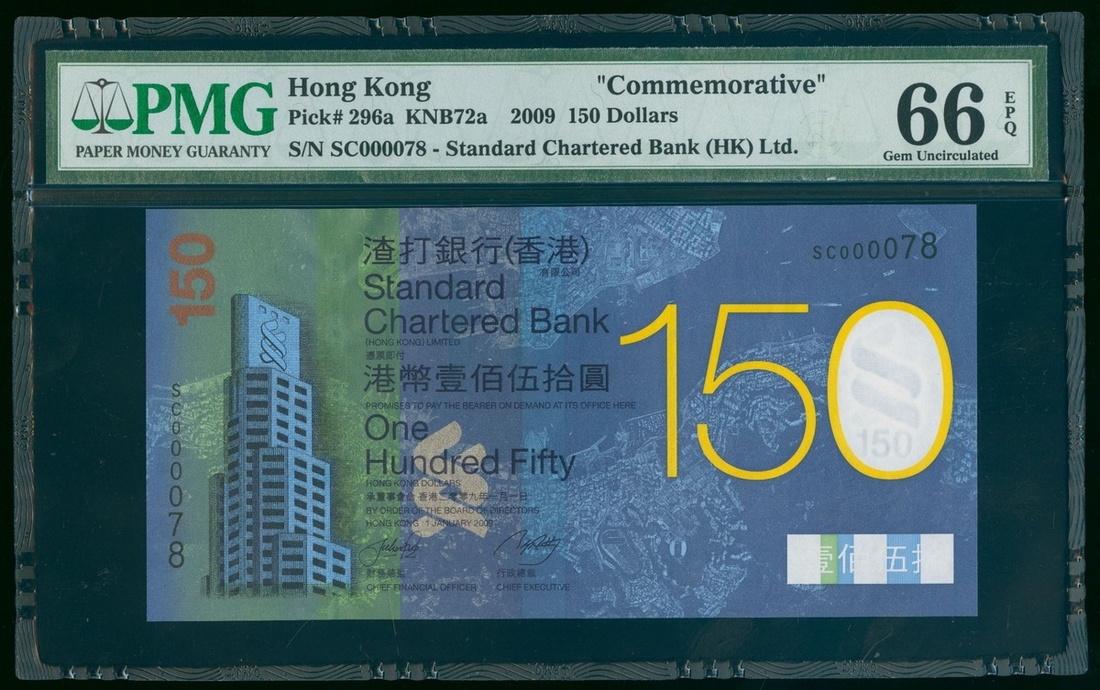 2009年渣打銀行$150,細號SC000078,渣打銀行150周年紀念版,PMG 66EPQ,罕見細號!
