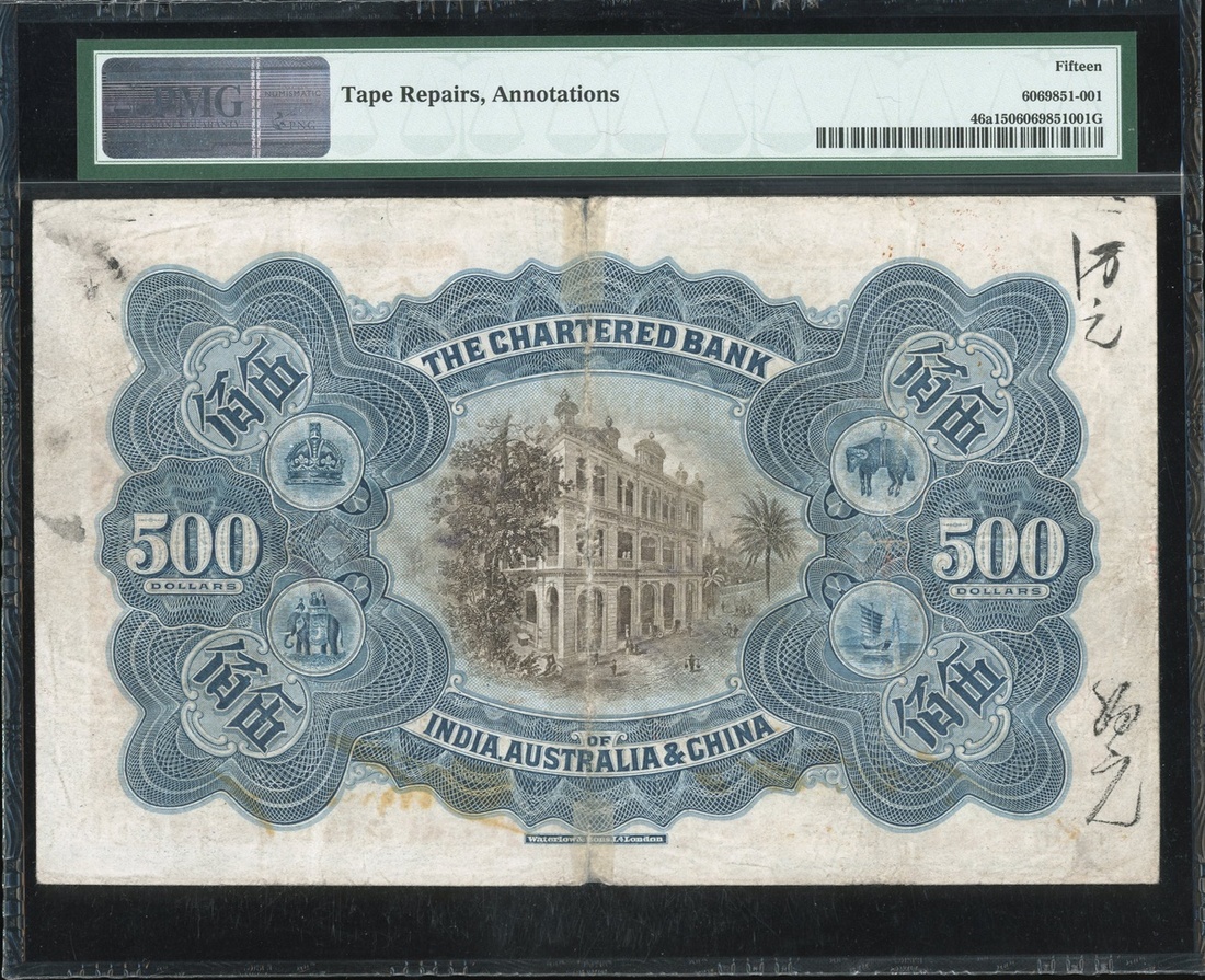 (Pick 46a), PMG 15 Choice Fine (Tape Repairs, Annotations). In the cataloguer's opinion this note is the earliest fully issued $500 for Hong Kong. Although earlier $500 notes do exist they are either specimens or cancelled and as such the historical signifance of 'the earliest known fully issued $500' cannot be overestimated. Only 3-4 issued notes of this type exist and the last time any appeared in auction was Spink China's sale in January 2014. A truly exceptional offering and surely a note which will be fiercely contested for on the auction floor. A truly exceptional offering