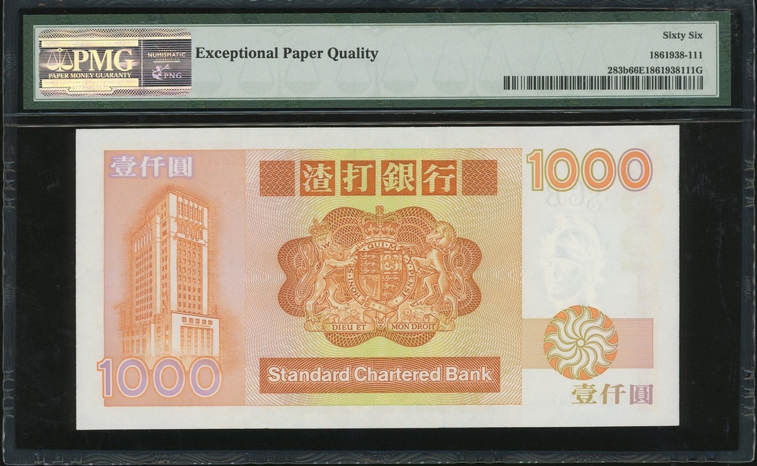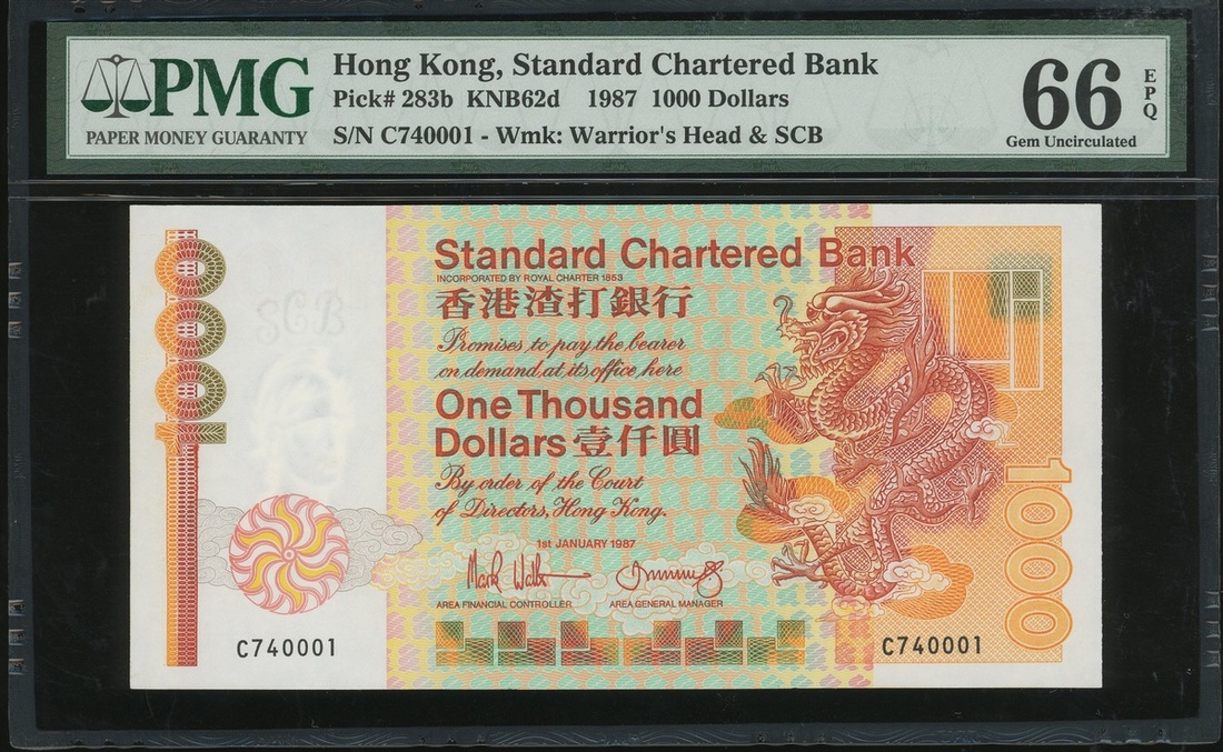 1987年渣打銀行$1000「長棍龍」,編號C740001,PMG 66EPQ,少見年份!