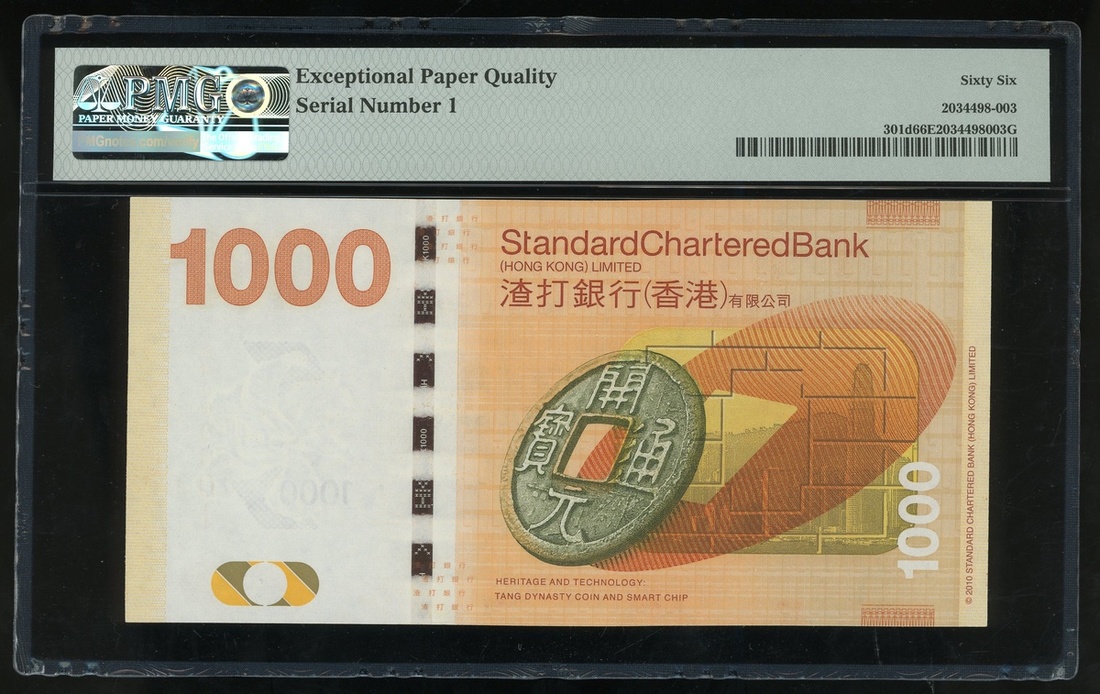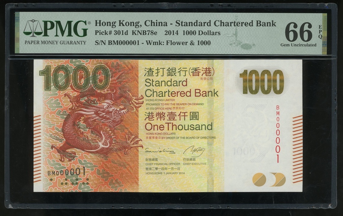 2014年渣打銀行$1000,編號BM000001,PMG 66EPQ,少見