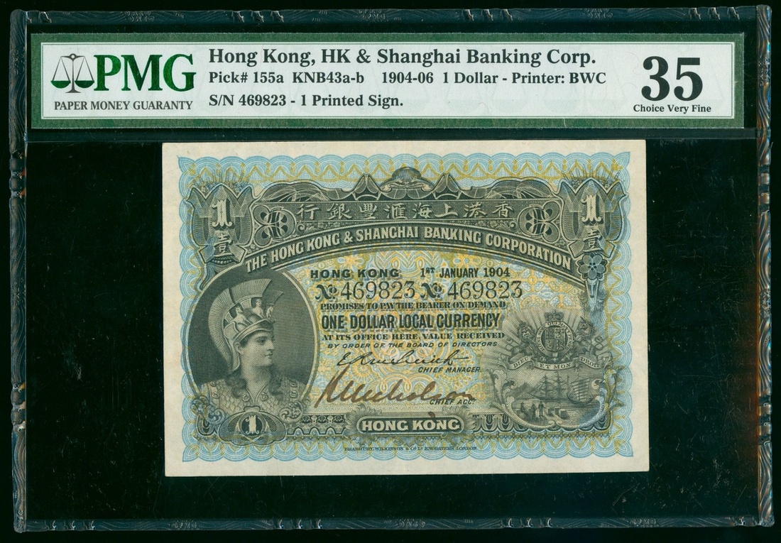 1904年滙豐銀行$1,編號469823,手簽票,PMG 35,首發年份美品。目前僅有6枚獲得比35分更高評分!