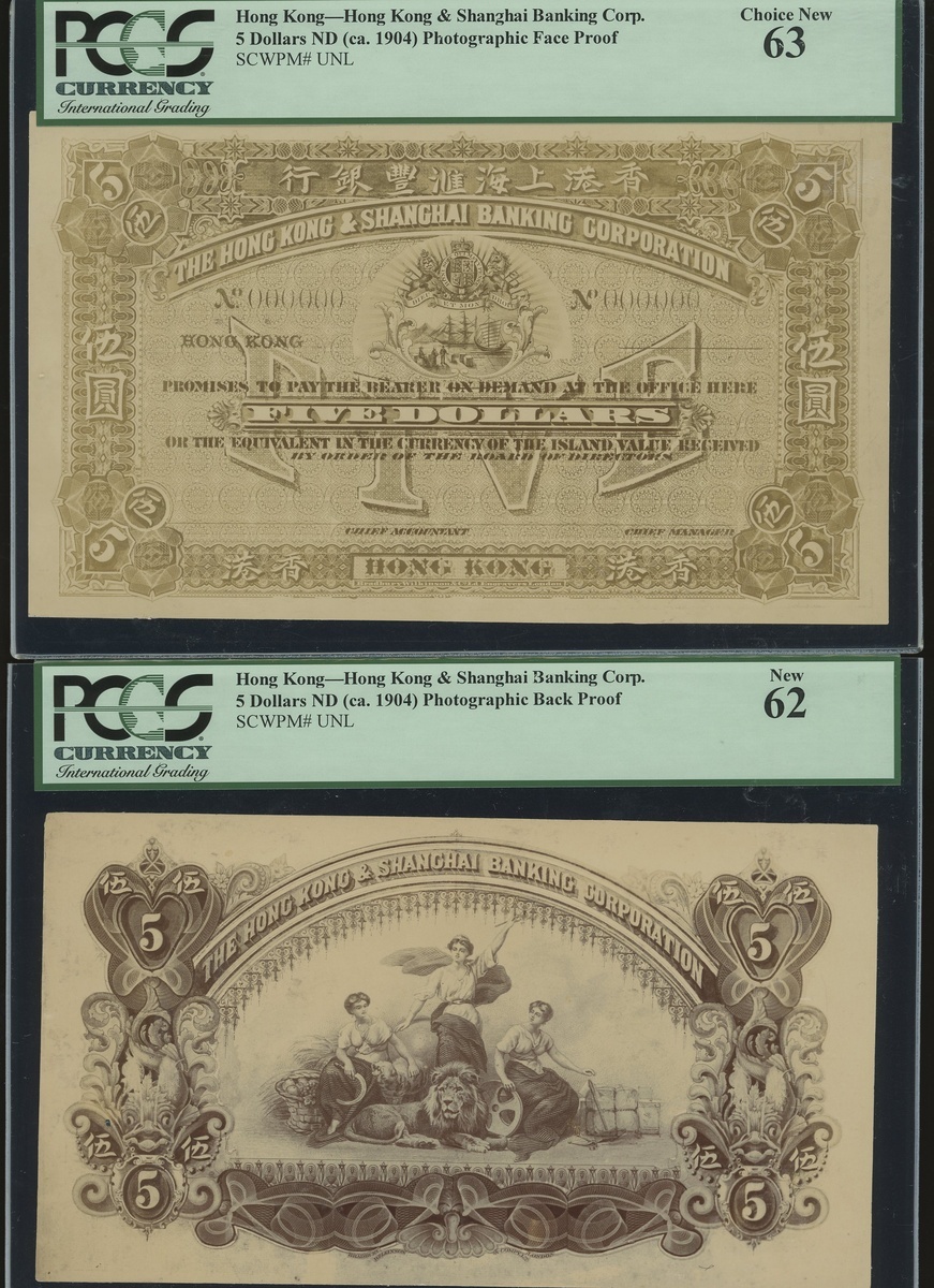 The Hongkong and Shanghai Banking Corporation, a pair of $5, Hong Kong, uniface obverse and reverse photographic proof, ND(ca. 1904), (Pick unlisted), graded PCGS Currency 63 and 62 respectively (2).
