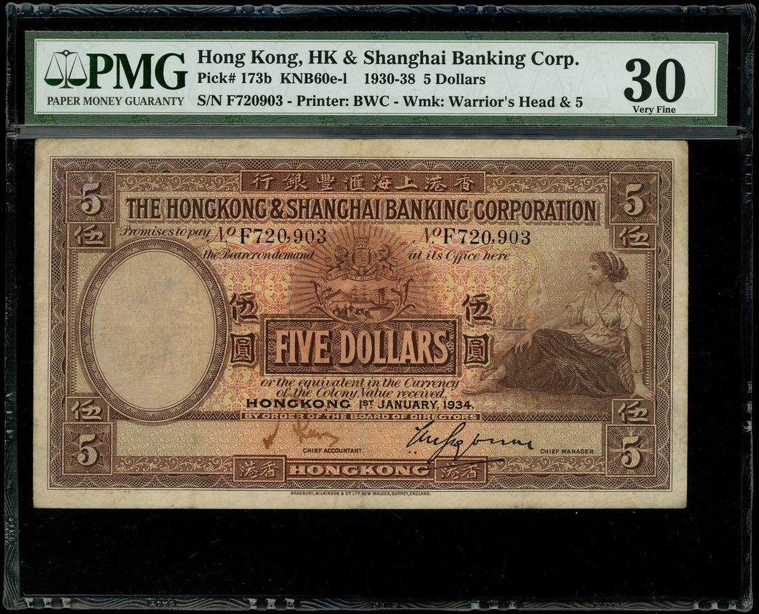The Hongkong and Shanghai Banking Corporation, $5, 1.1.1934, serial number F720903, handsigned at lower left,