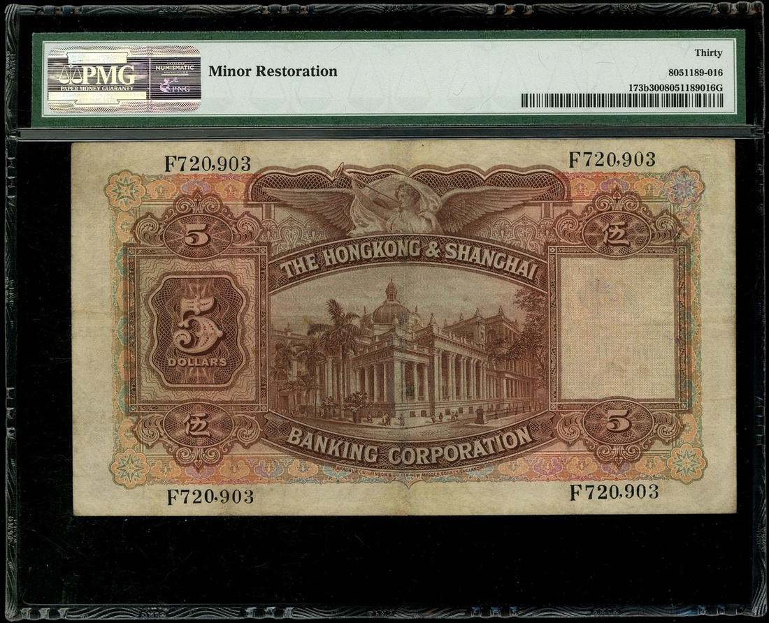 1934年香港上海匯豐銀行$5,編號 F720903,手簽票, PMG 30,輕微修補