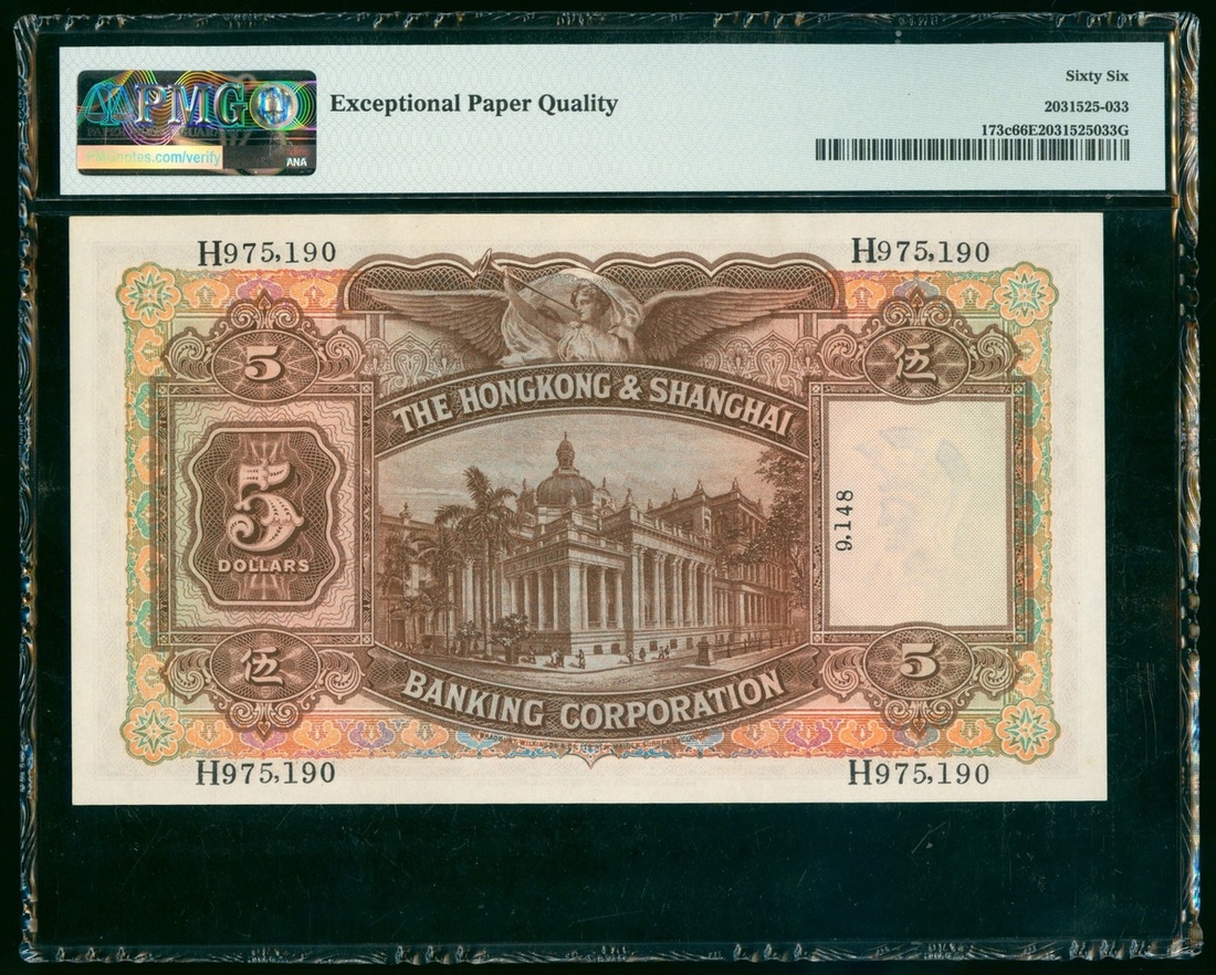 1940年香港上海匯豐銀行$5,迫簽票,編號H975190,垂直編號9148,PMG 66EPQ,經典版別,Pick 173c 包括了1941 年的迫簽票,