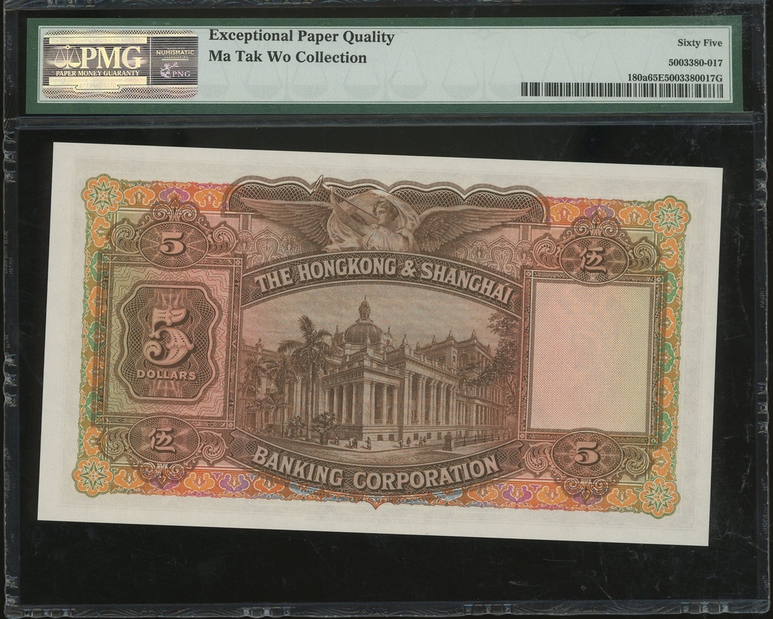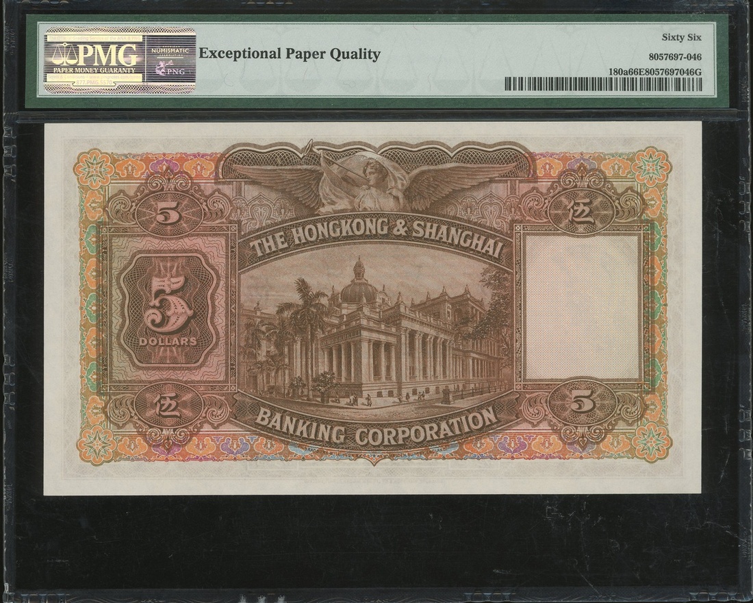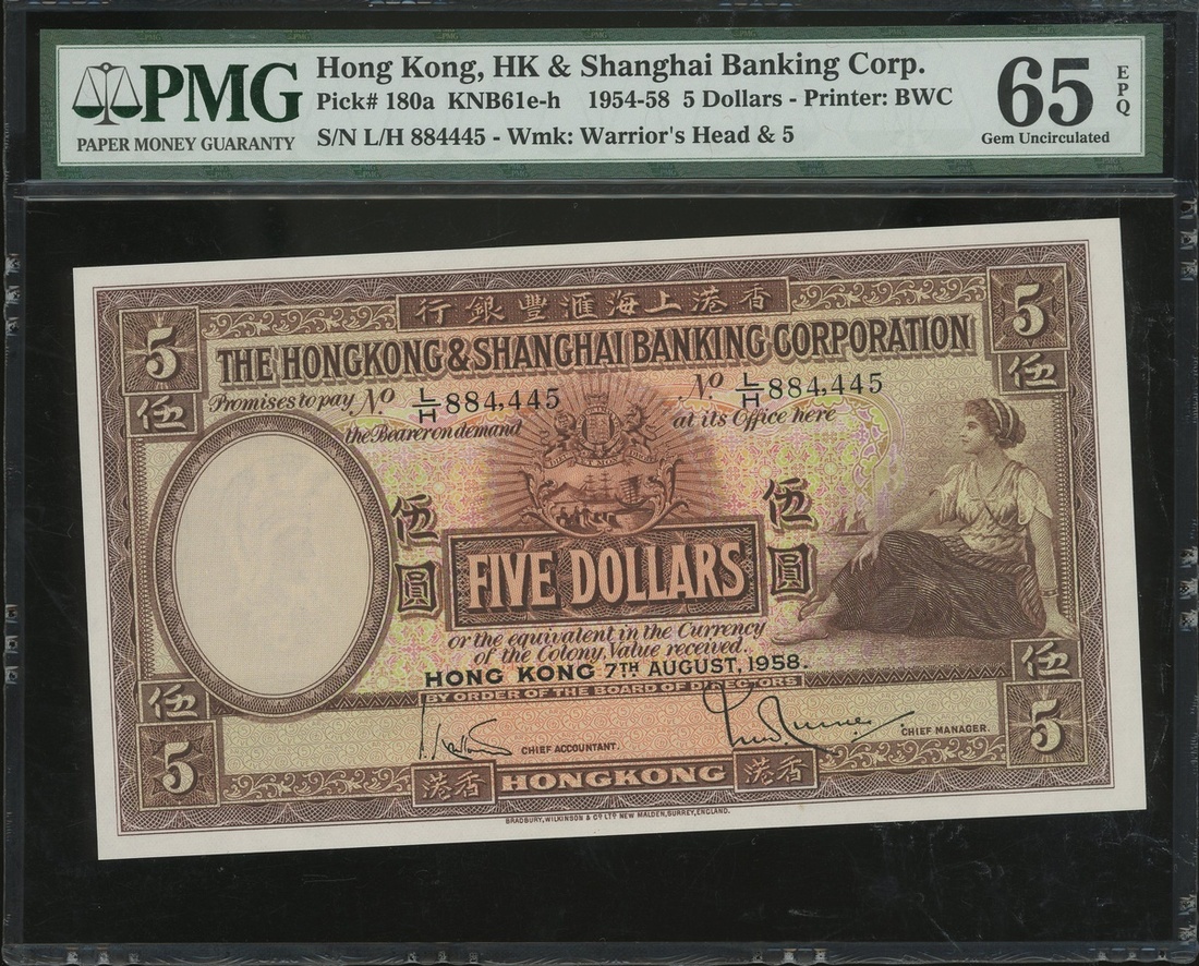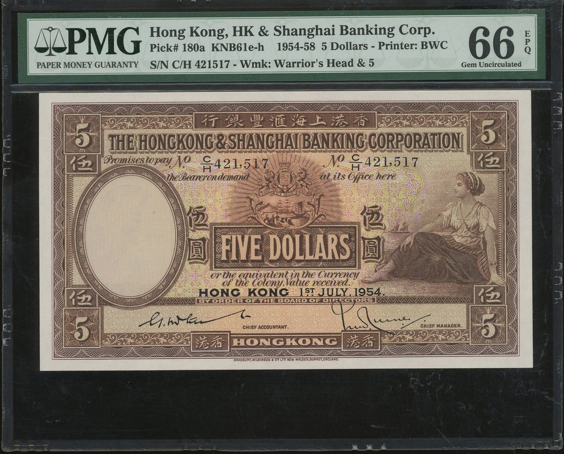 The Hongkong and Shanghai Banking Corporation, a pair of $5, 1954 and 1958, serial numbers C/H 421517 and L/H 884445, (Pick 180a), graded PMG 66EPQ and 65EPQ respectively (2).