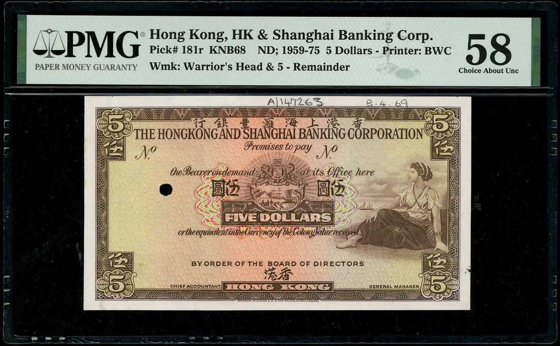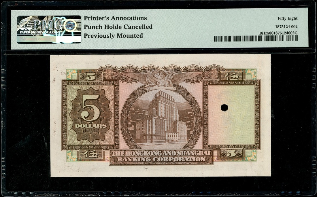 The Hongkong and Shanghai Banking Corporation, $5, proof, no date (1959-1975), (Pick 181r), PMG 58 Choice About Uncirculated (Printer's Annotations, Punch Hole Cancelled, Previously Mounted). Rare in this formation