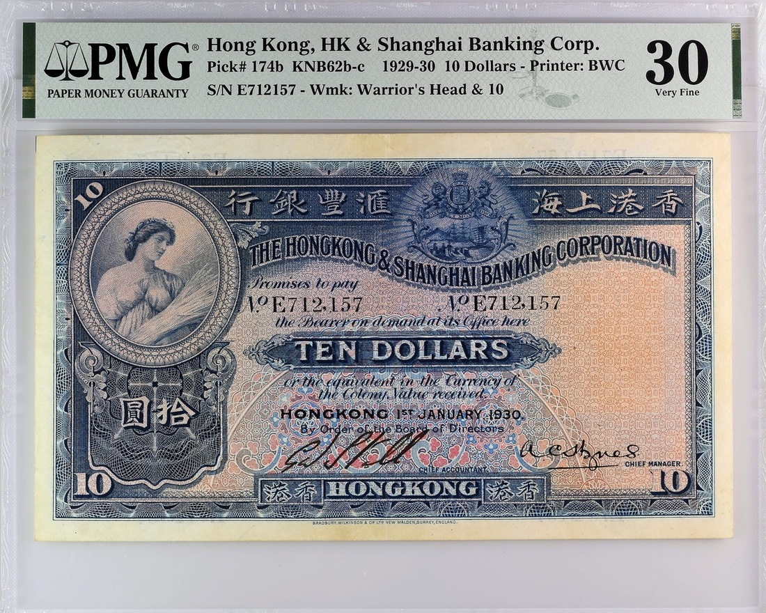 The Hongkong and Shanghai Banking Corporation, $10, 1.1.1930, serial number E712157, handsigned at lower left,