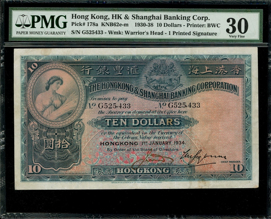 The Hongkong and Shanghai Banking Corporation, $10, 1.1.1934, serial number G525433, handsigned at lower left,