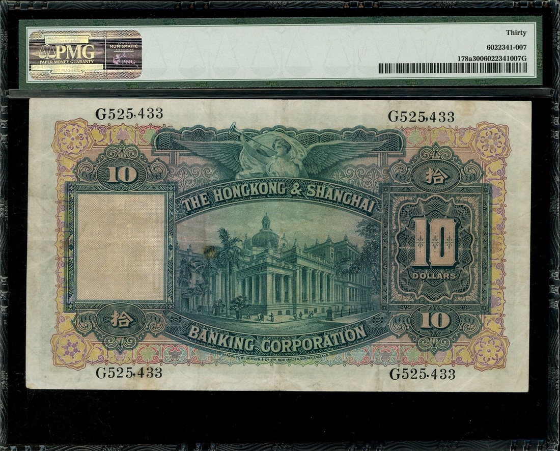 1934年香港上海匯豐銀行$10,編號 G525433,PMG 30