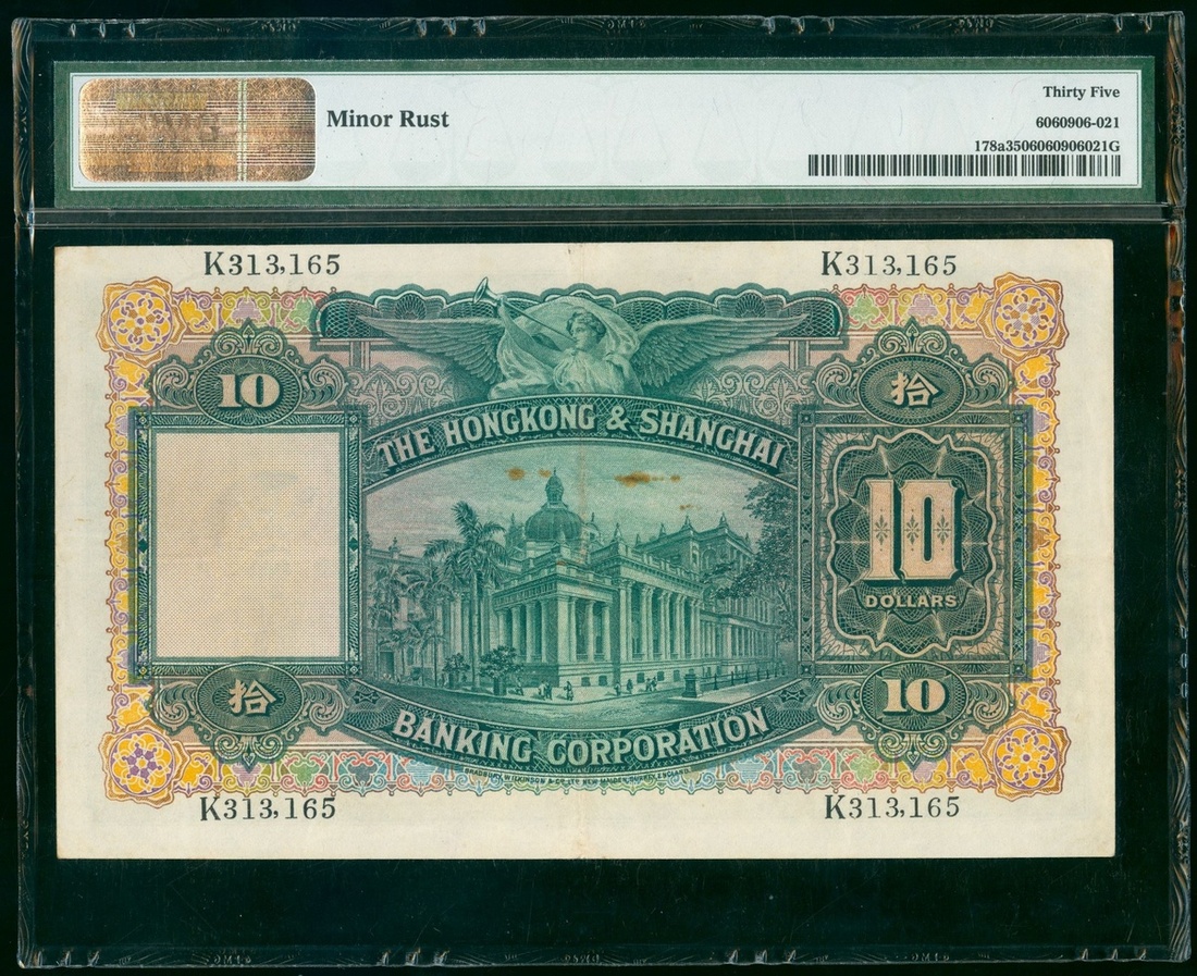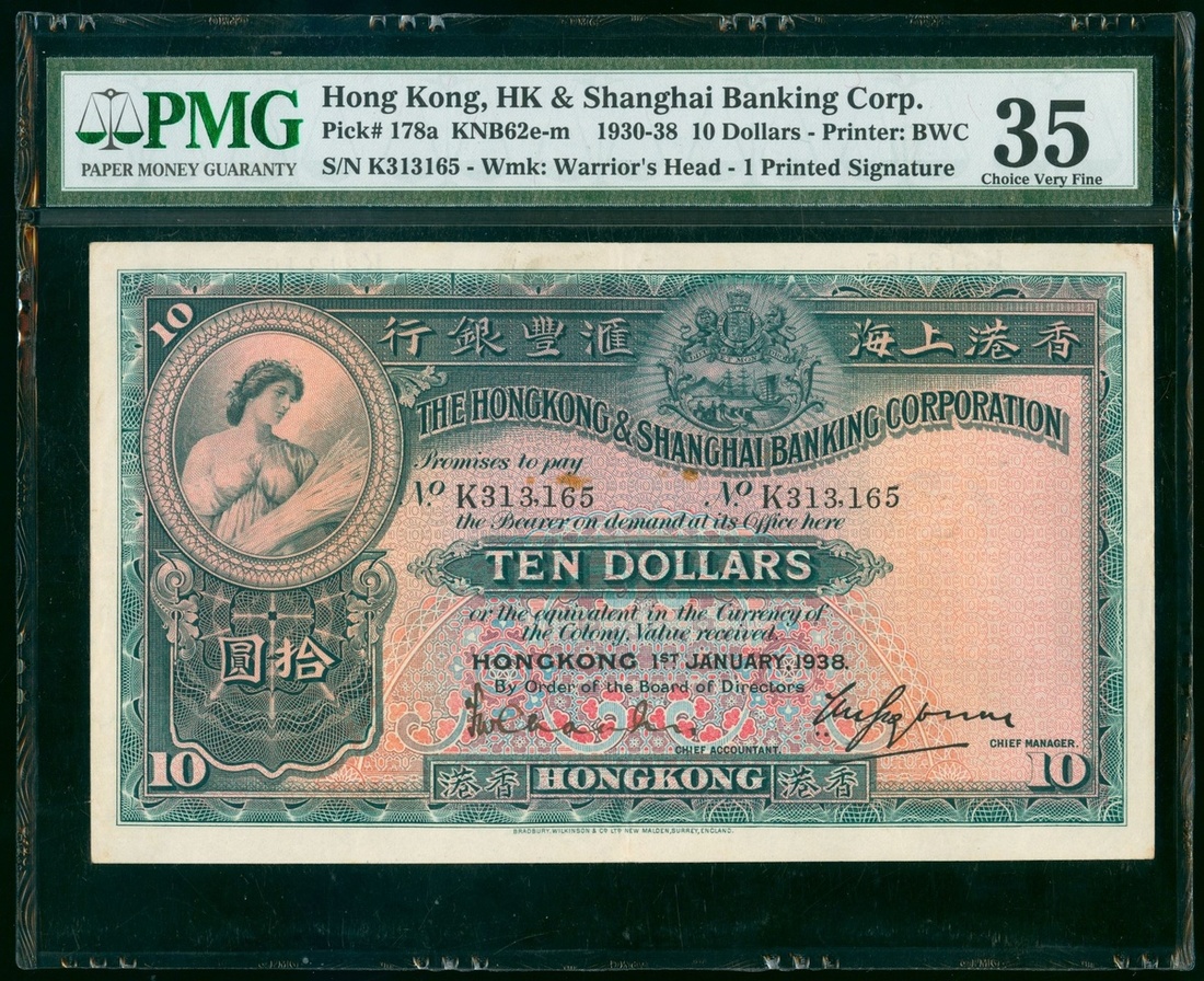 The Hongkong and Shanghai Banking Corporation, $10, 1.1.1938, serial number K313165, (Pick 178a), PMG 35 Choice Very Fine (Minor Rust).