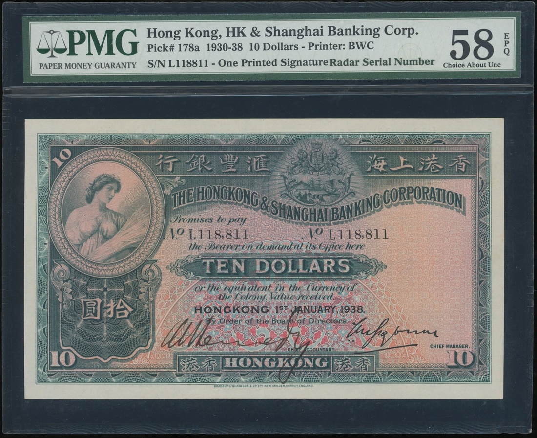 The Hongkong and Shanghai Banking Corporation, $10, 1.1.1938, radar serial number L118811, handsigned at lower left,