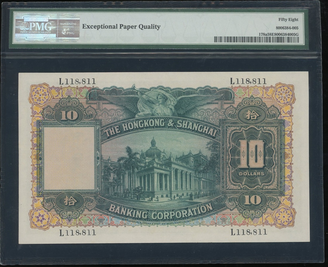 1938年香港上海匯豐銀行$10,雷達號 L118811,PMG 58EPQ,美品
