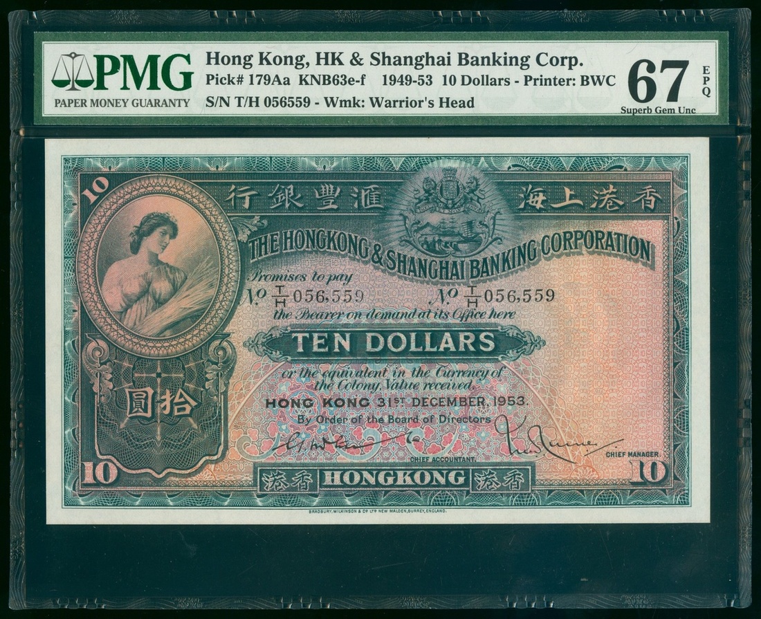 The Hongkong and Shanghai Banking Corporation, $10, 31.12.1953, serial number T/H 056559, (Pick 179Aa), PMG 67EPQ Superb Gem Uncirculated and very choice