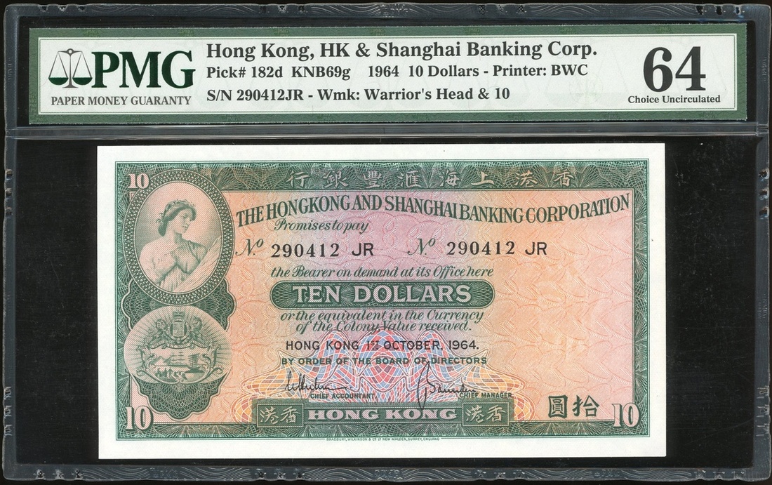 The Hongkong and Shanghai Banking Corporation, $10, 1.10.1964, serial number 290412JR, (Pick 182d), PMG 64 Choice Uncirculated. Key date of the this series and scarce!