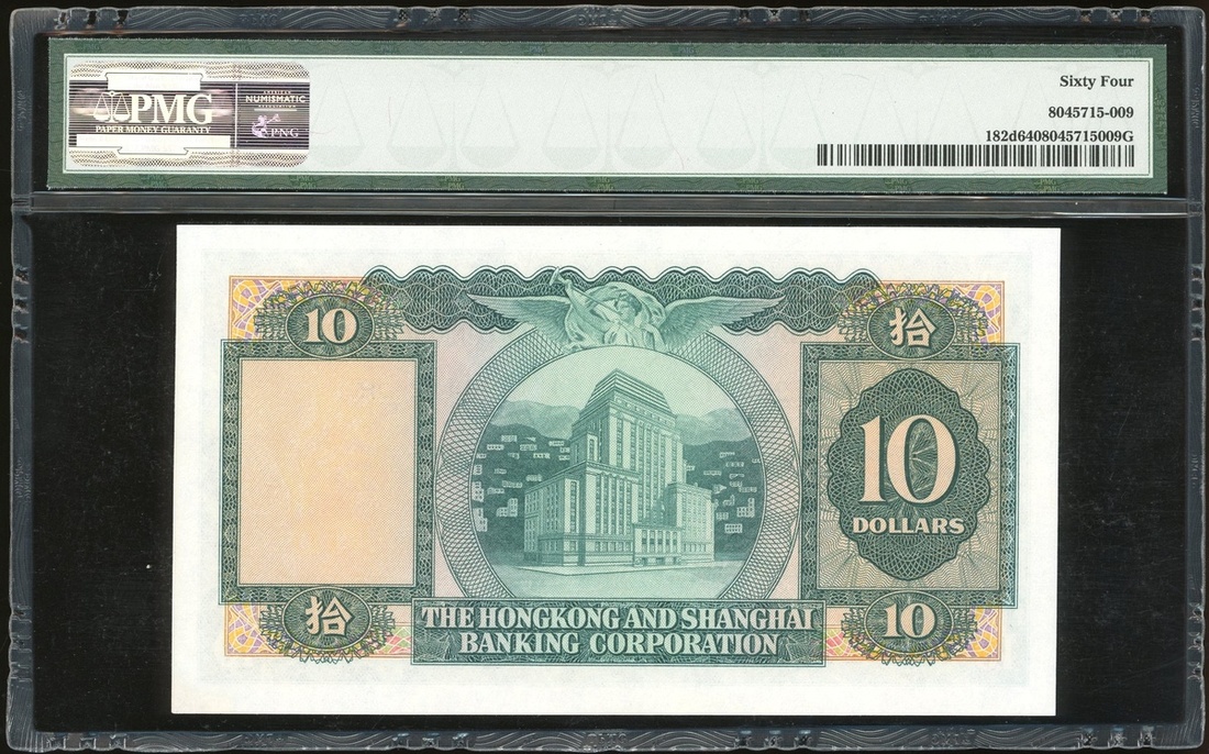 1964年10月香港上海匯豐銀行$10,編號290412JR,PMG 64,少見年份!