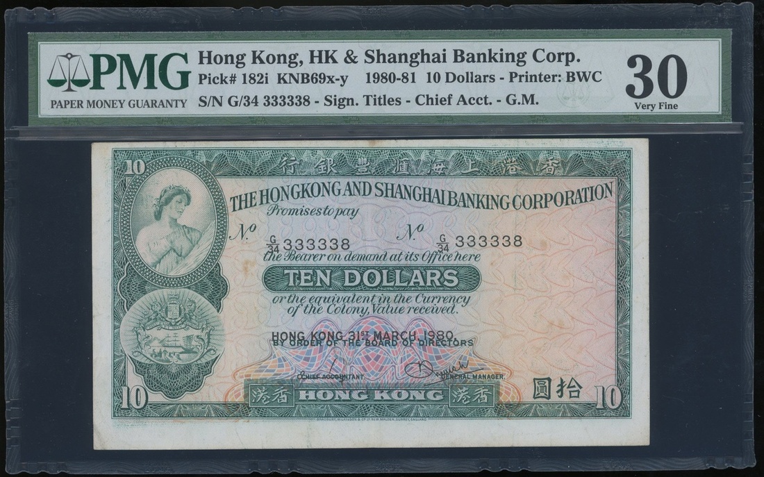 The Hongkong and Shanghai Banking Corporation, $10, 31.3.1980, ERROR NOTE with a fancy serial numbers G/34 333338, the serial numbers, date and signatures all shifted towards the lower border,