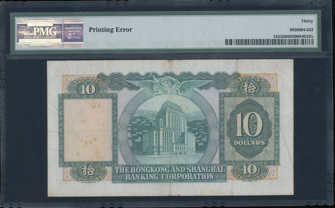 1980年香港上海匯豐銀行$10,印刷移位錯體,趣味號G/34 333338,PMG 30,不可多得的一枚趣味號錯體