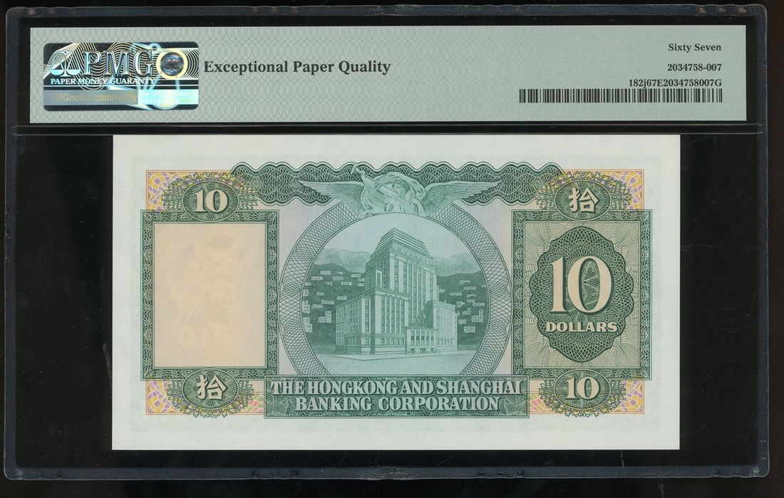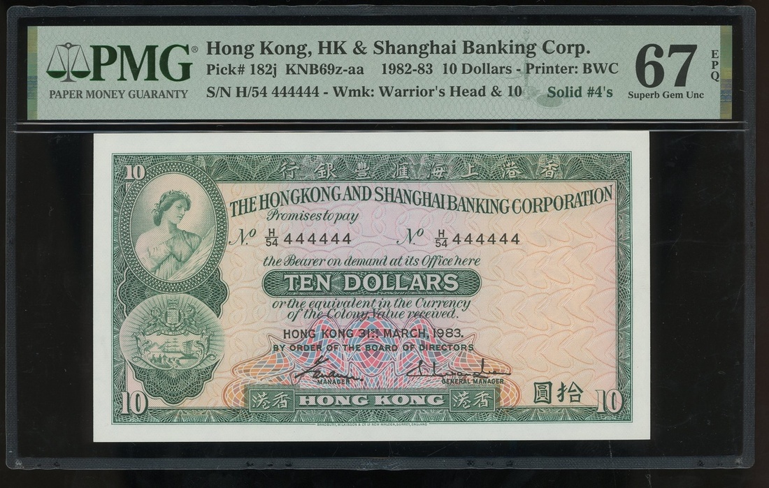 The Hongkong and Shanghai Banking Corporation, $10, 31.3.1983, solid serial number H/54 444444, (Pick 182j), PMG 67EPQ Superb Gem Uncirculated