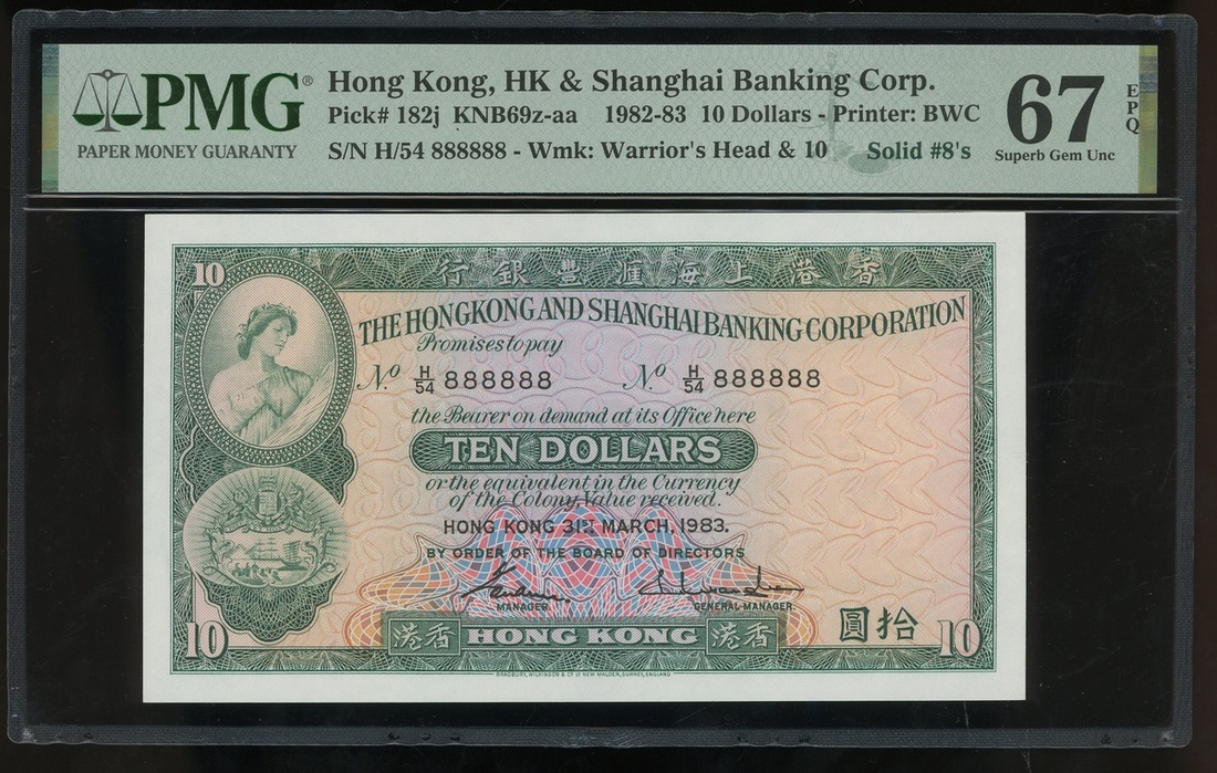 The Hongkong and Shanghai Banking Corporation, $10, 31.3.1983, solid serial number H/54 888888, (Pick 182j), PMG 67EPQ Superb Gem Uncirculated