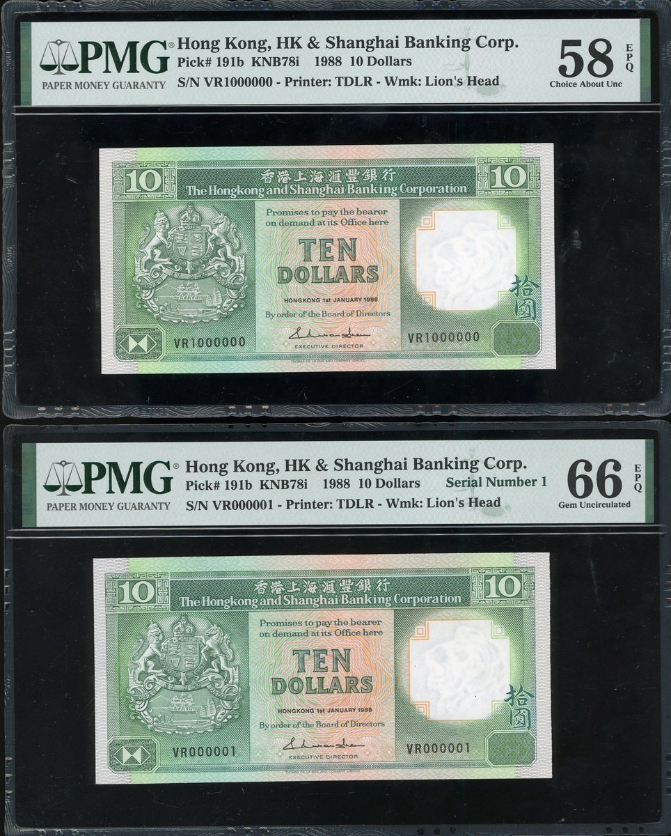 The Hongkong and Shanghai Banking Corporation, a pair of $10, 1.1.1988, lucky numbers VR000001 and VR1000000, (Pick 191b), graded PMG 58EPQ and 66EPQ respectively (2).